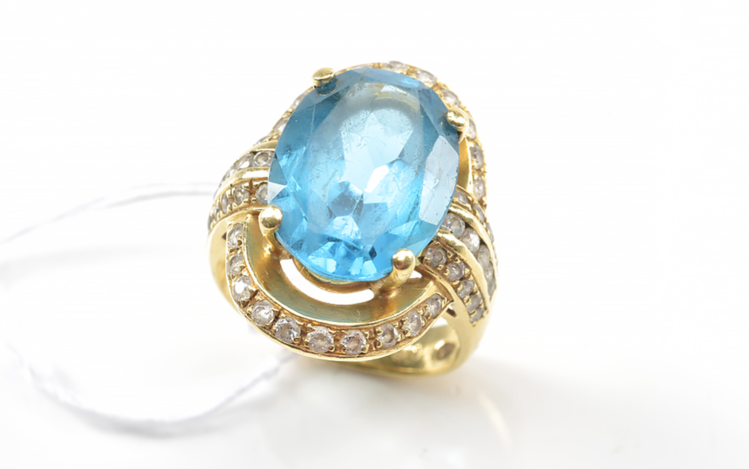 A BLUE TOPAZ COCKTAIL RING ESTIMATED 11.45CTS, IN 18CT GOLD, SIZE O, 10.7GMS