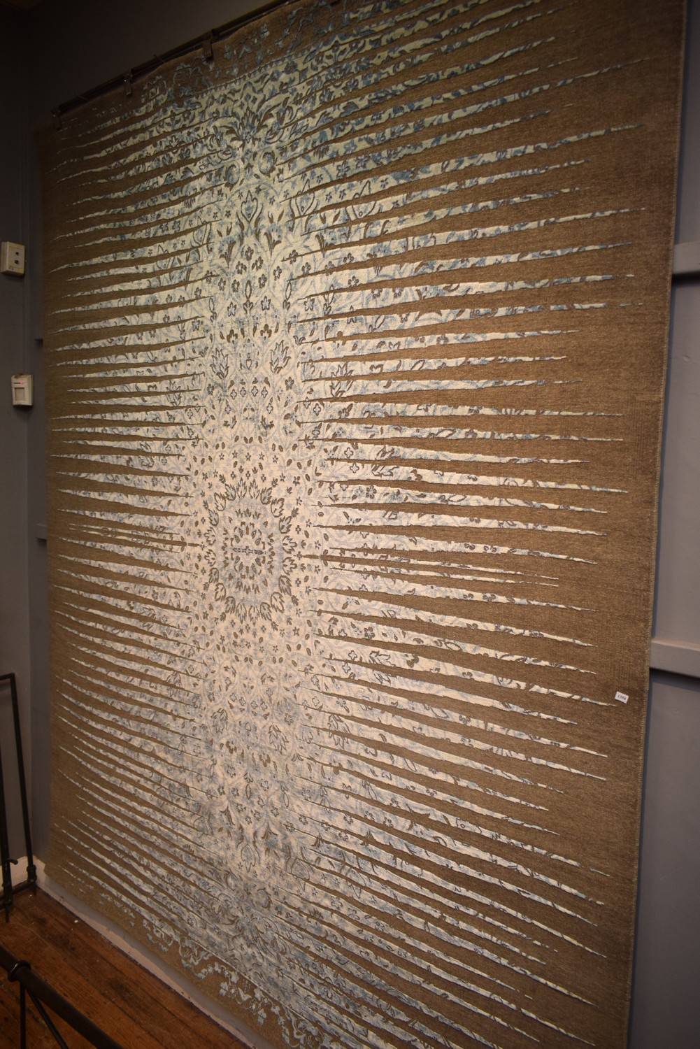 A FINELY HAND-KNOTTED MODERN DESIGNER CARPET. SILK INLAYS WITHIN A WOOLEN PILE. GALLERY EXHIBITED CARPET. NEW & IN PRISTINE CONDITION. MODERN SUNBURST DESIGN WITH EMBOSSED PATTERNS. THE ENTIRE IN TONES OF BROWN, CREAM & SOFT BLUE. CERTIFICATE OF AUTHENTICITY INCLUDED. SIZE: 302X245CM, ORIGIN: INDIA – RRP: $8,500