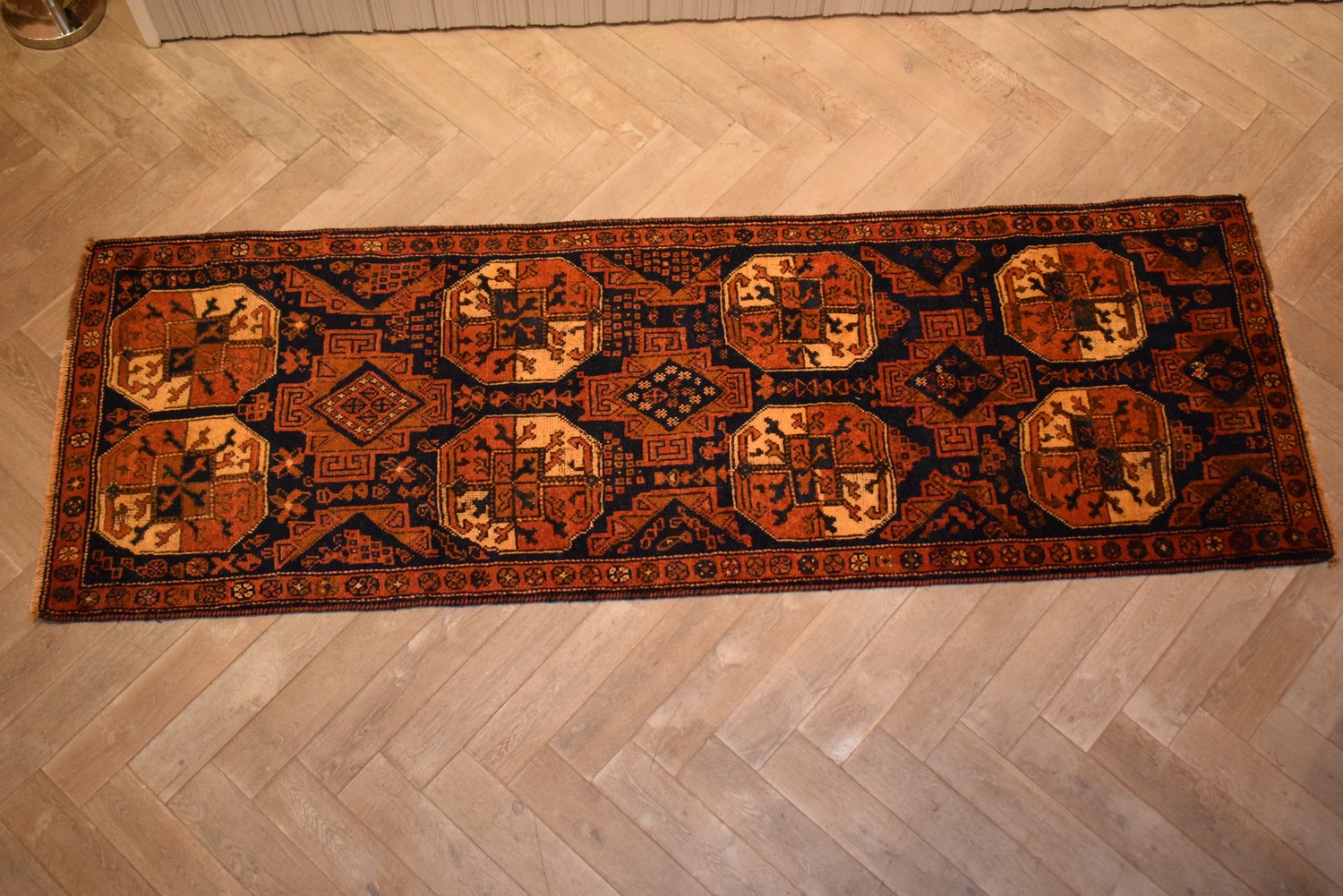 A TRIBAL PERSIAN LURI HALL RUNNER. 100% WOOL. EX-GALLERY STOCK. RESTORED AND IN GOOD CONDITION. TRIBAL WEAVE AND DESIGN OF REPEATING BOLD MEDALLIONS IN A BLUE FIELD OF SECONDARY FLORAL PATTERNS BORDER OF FLOWER HEADS. CERTIFICATE OF AUTHENTICITY INCLUDED. SIZE: 325X120CM, ORIGIN: PERSIA – RRP: $3,800