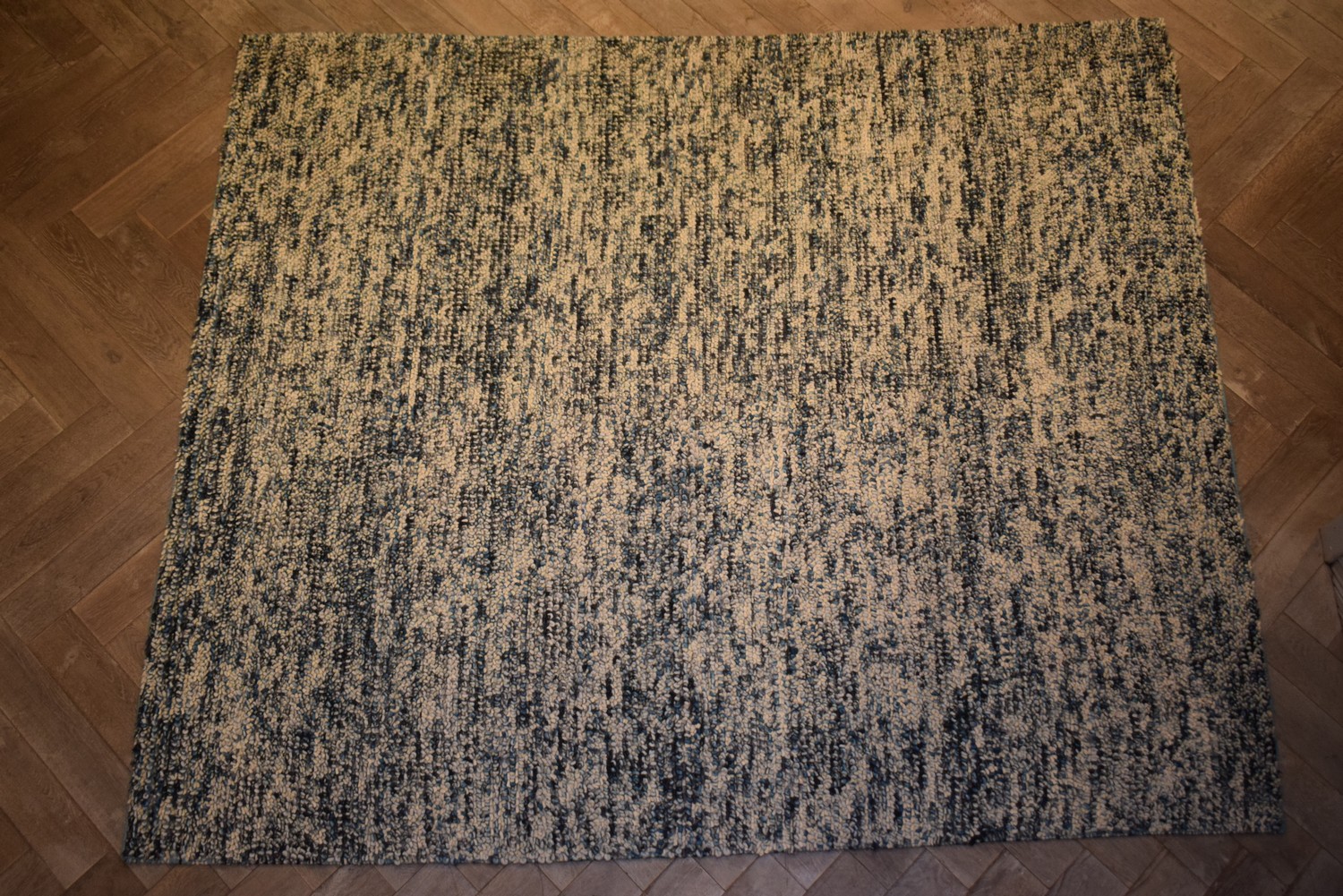 A COLOURFUL MODERN SHAGPILE CARPET. 100% WOOL. BRAND NEW & IN EXCELLENT CONDITION. THE ENTIRE IN VIBRANT TONES OF CREAM, BLUES & CHARCOAL. SIZE: 300X245CM, ORIGIN: INDIA – RRP: $2,400