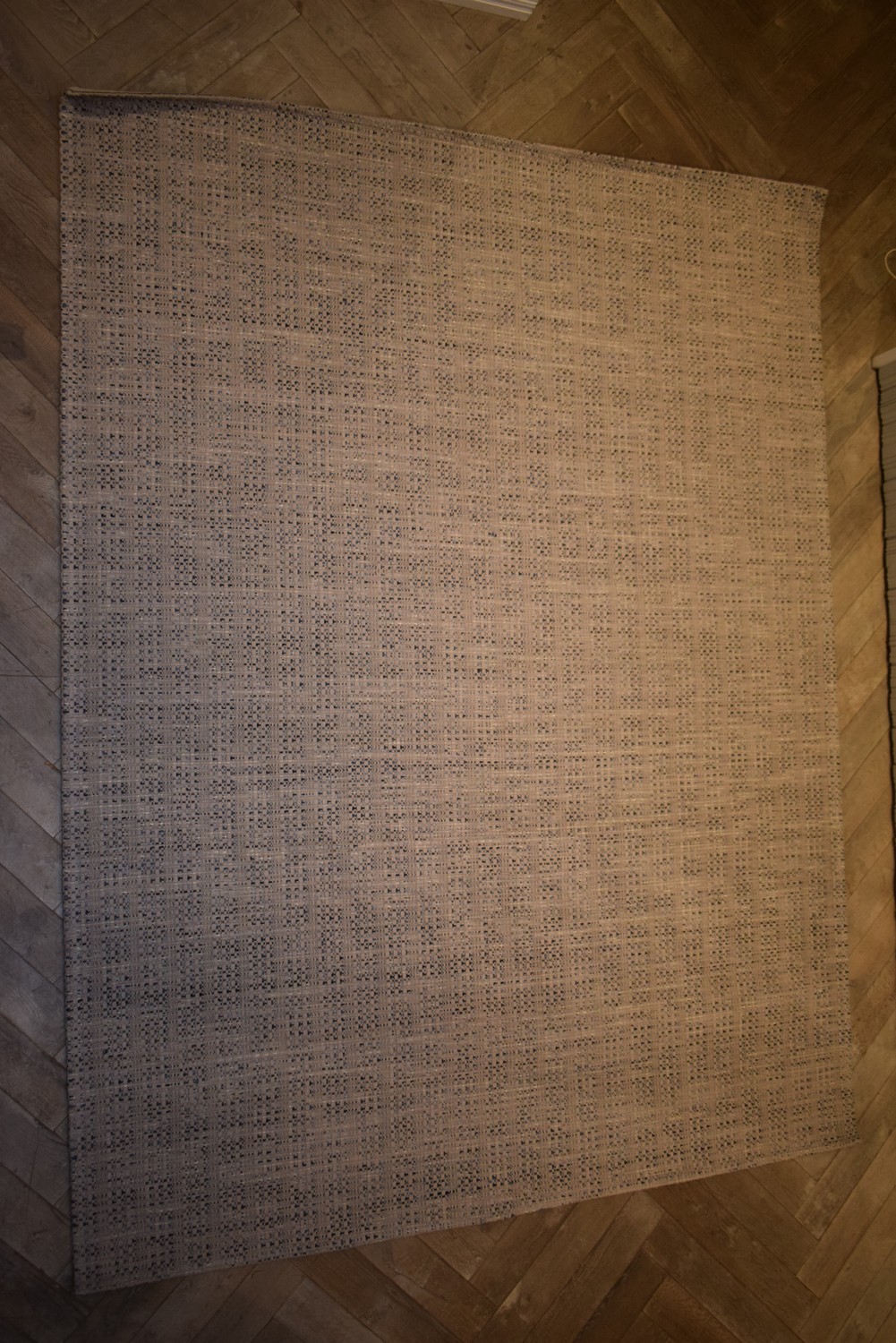A BRAND-NEW MODERN 'BASKET-WEAVE' DESIGN CARPET IN TONES OF CREAM AND BLUES. HAND-TUFTED. IN SUPERB CONDITION. SIZE: 360X270CM, ORIGIN: INDIA – RRP: $2,400
