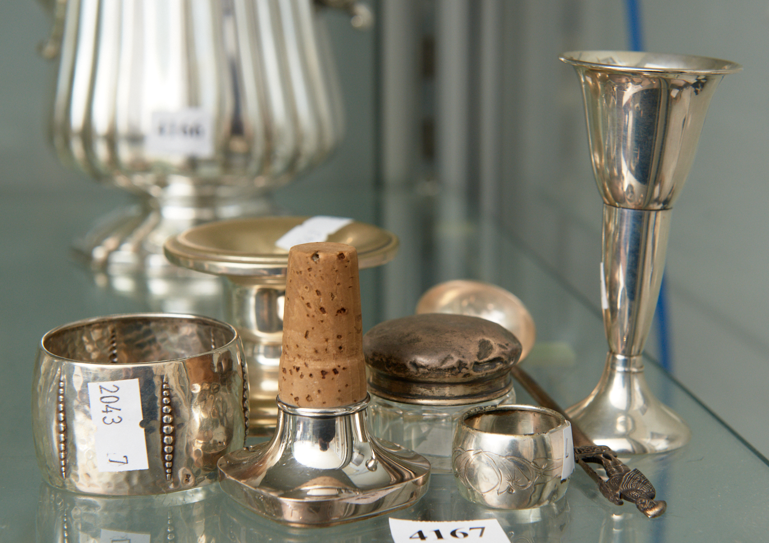 COLLECTION OF SILVER INCLUDING CANDLESTICK, PERUVIAN SPOON, WMF BOTTLE STOP