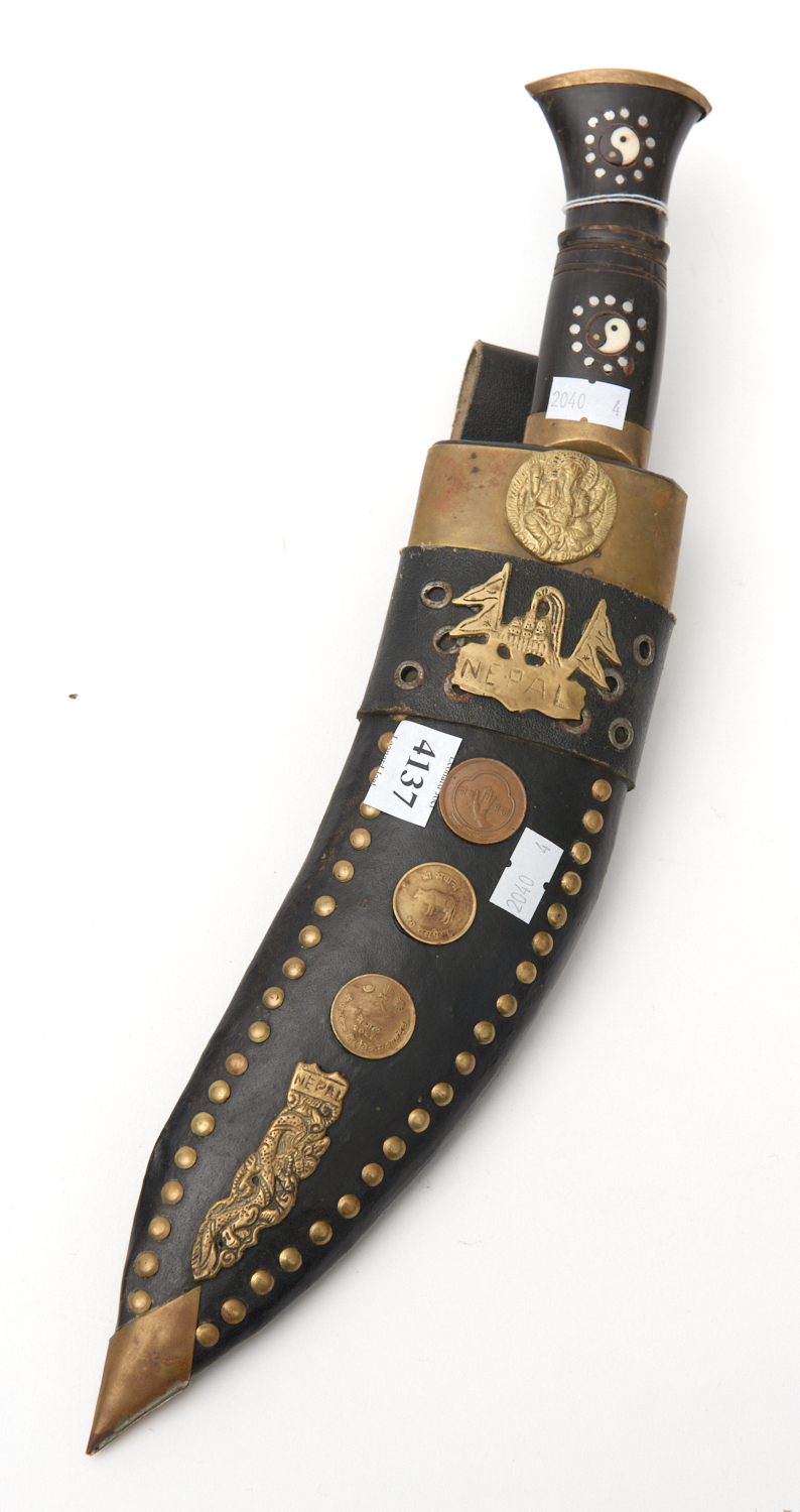 A NEPALESE KUKRI IN LEATHER SCABBARD - NOTE: AN EDGED WEAPONS LICENSE IS REQUIRED TO VIEW, PURCHASE AND COLLECT