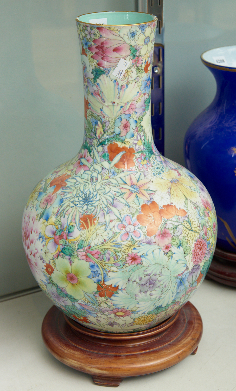A CHINESE PORCELAIN VASE WITH FAMILLE ROSE DECORATION ON WOODEN STAND (A/F CHIP TO RIM)