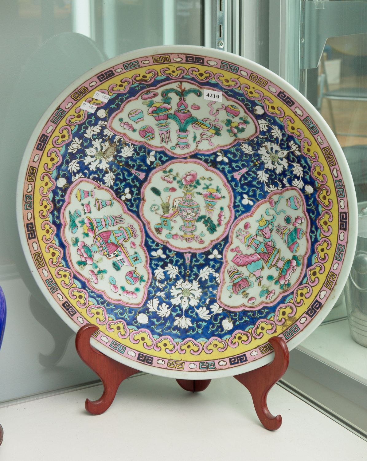 A LARGE CHINESE POTTERY CHARGER IN BLUE AND YELLOW TONES ON A WOODEN STAND AND PLINTH