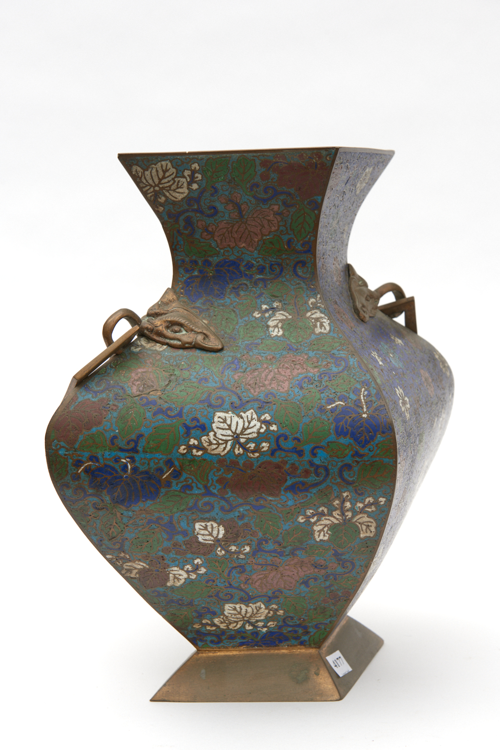 A CHINESE CLOISONNÉ VASE WITH BRASS DETAILED HANDLES ON A WOODEN BASE