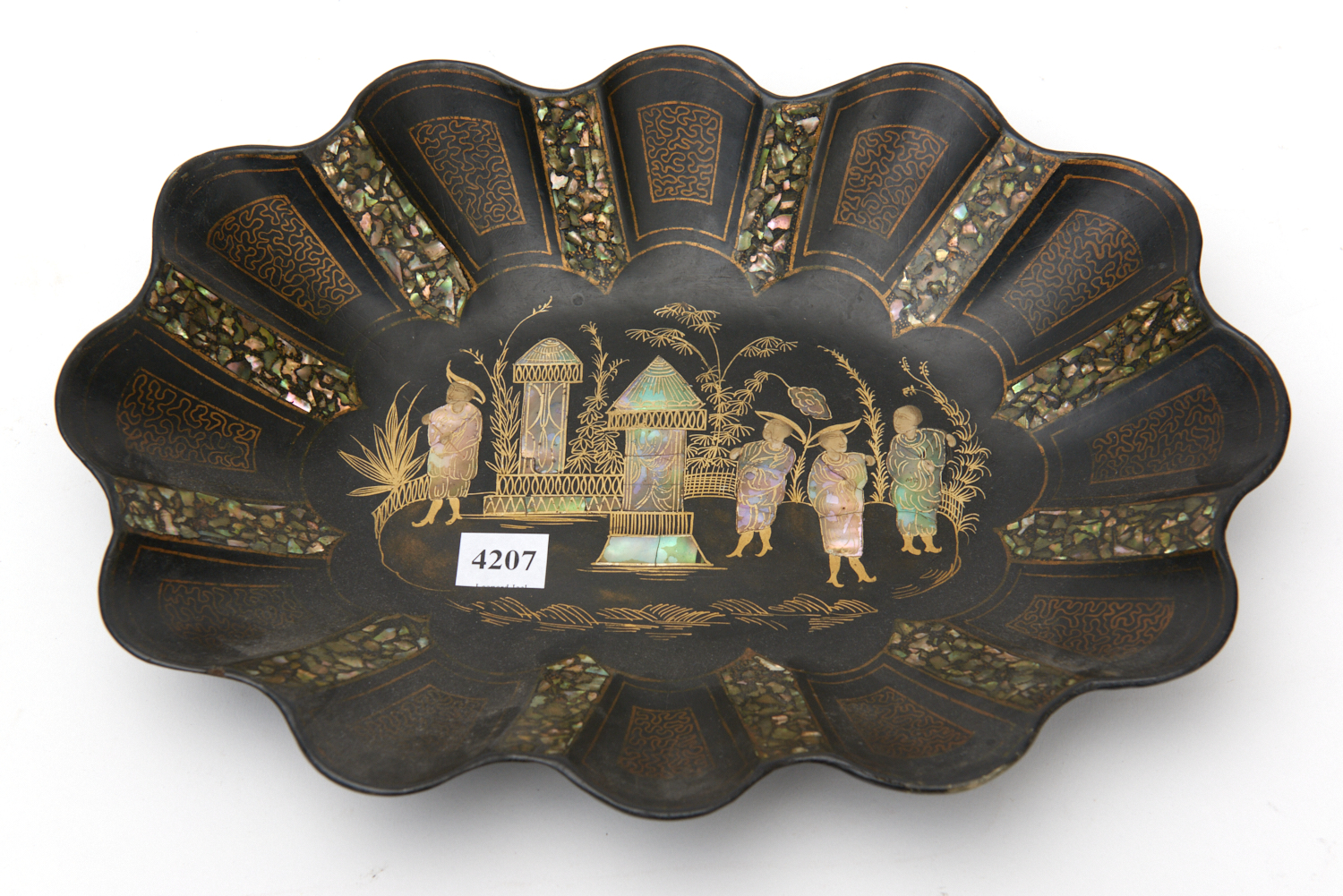 A PAPIER MACHE AND MOTHER OF PEARL FLUTED DISH
