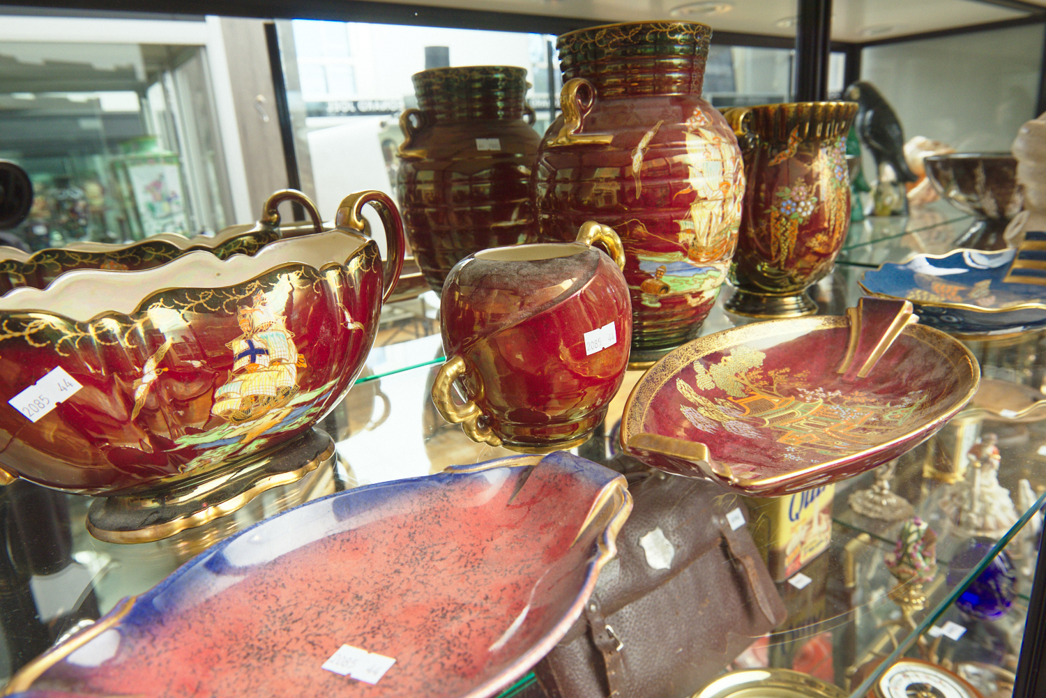 A COLLECTION OF CARLTONWARE ROUGE ROYALE AND CROWN DEVON CERAMICS, INCLUDING FOUR TWO HANDLED VASES AND THREE DISHES