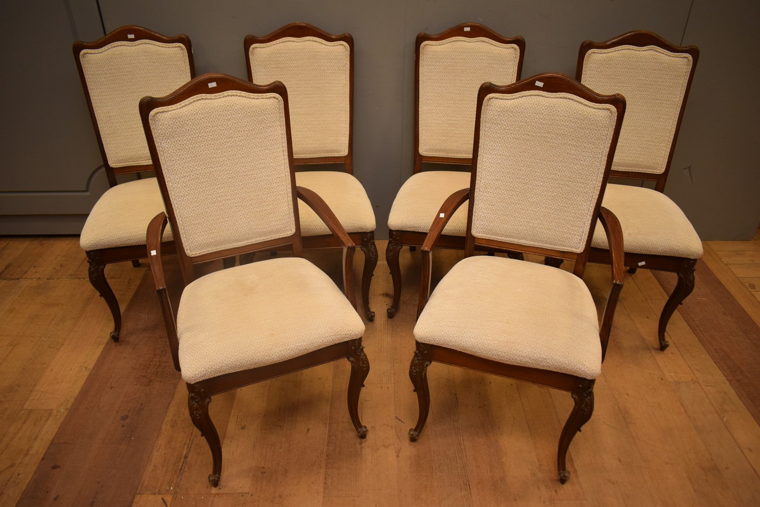 SIX PROVINCIAL STYLE CHAIRS IN WARWICK FABRIC, INCLUDING TWO CARVERS (CARVERS 102H X 54W X 42D CM)
