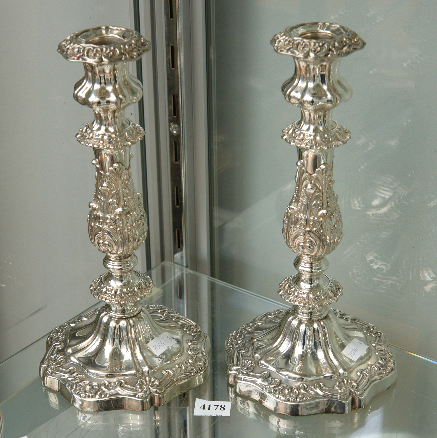 A PAIR OF GEORGIAN SHEFFIELD PLATE CANDLESTICKS