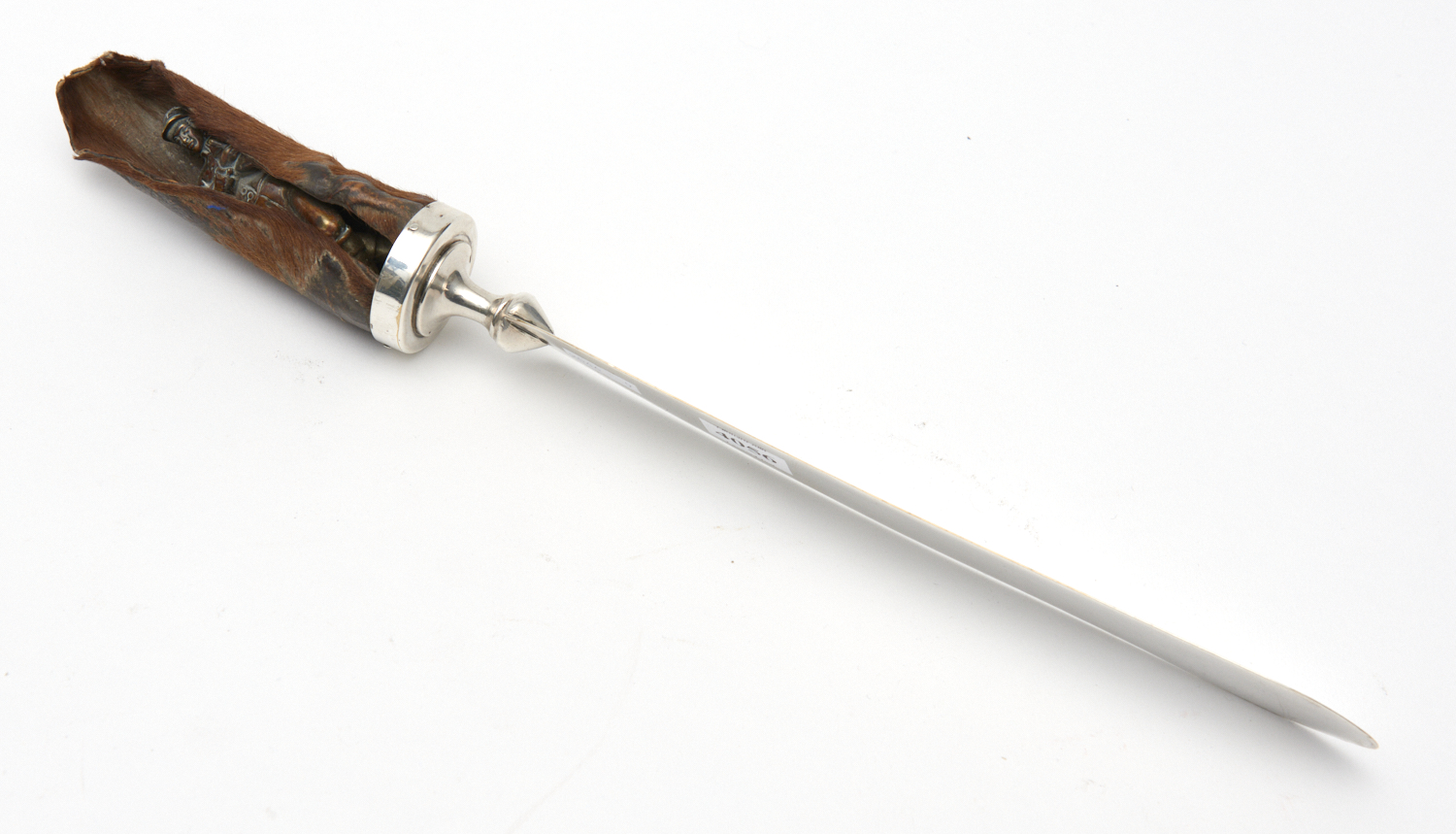 A 19TH CENTURY SILVERPLATE AND BRONZE JOCKEY LETTER OPENER/PAGE TURNER, THE HANDLE CRAFTED FROM A HORSE EAR
