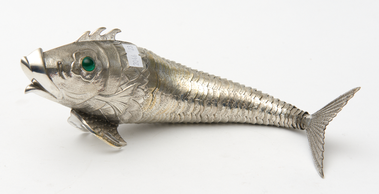 A 1900S ITALIAN SILVERPLATE ARTICULATED FISH WITH INSET SEMI PRECIOUS STONE EYES
