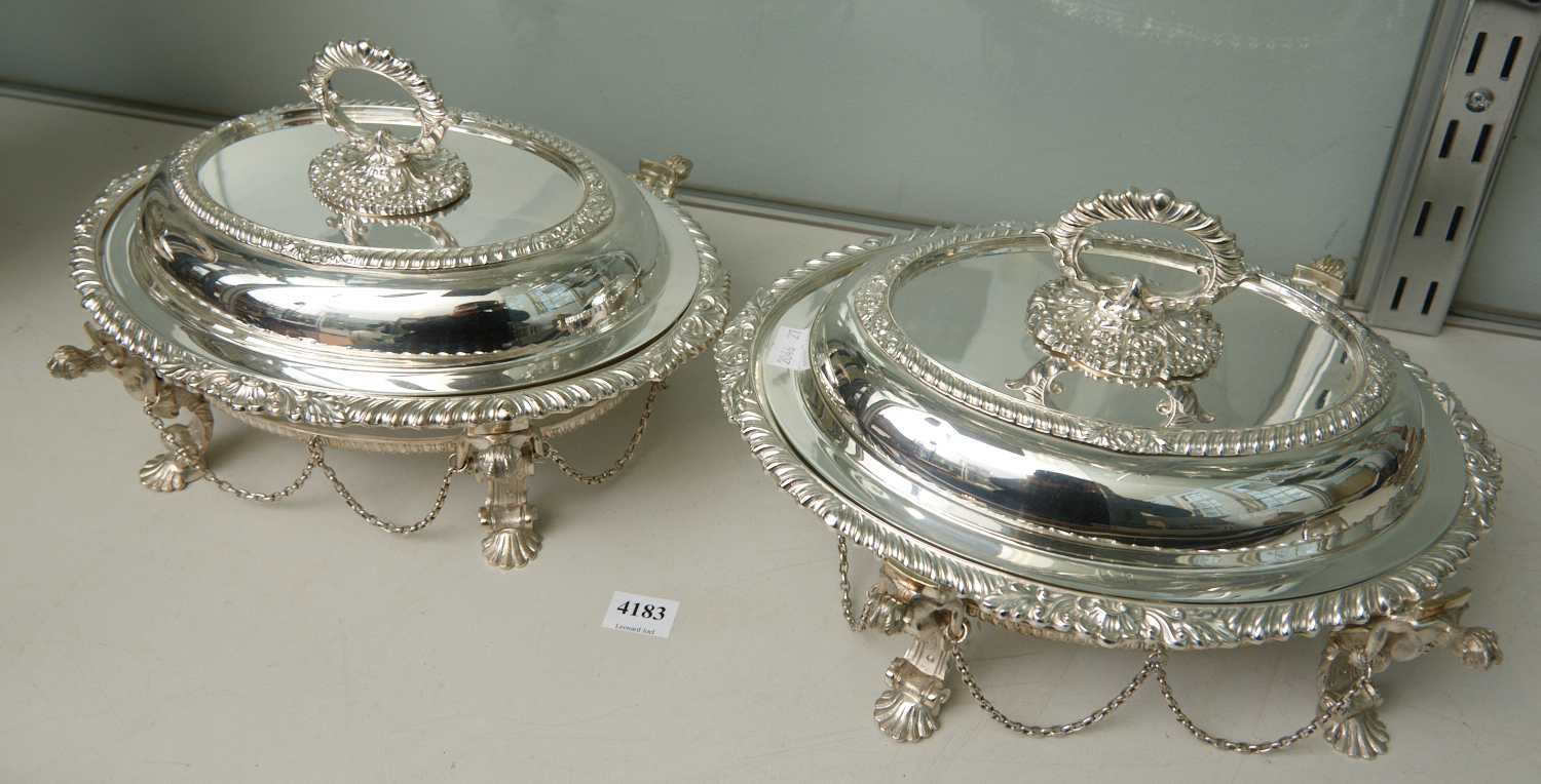 A PAIR OF 19TH CENTURY WM DRUMMOND & CO SILVERPLATE SERVING TUREENS ON BASES DECORATED WITH FIGURAL LEGS