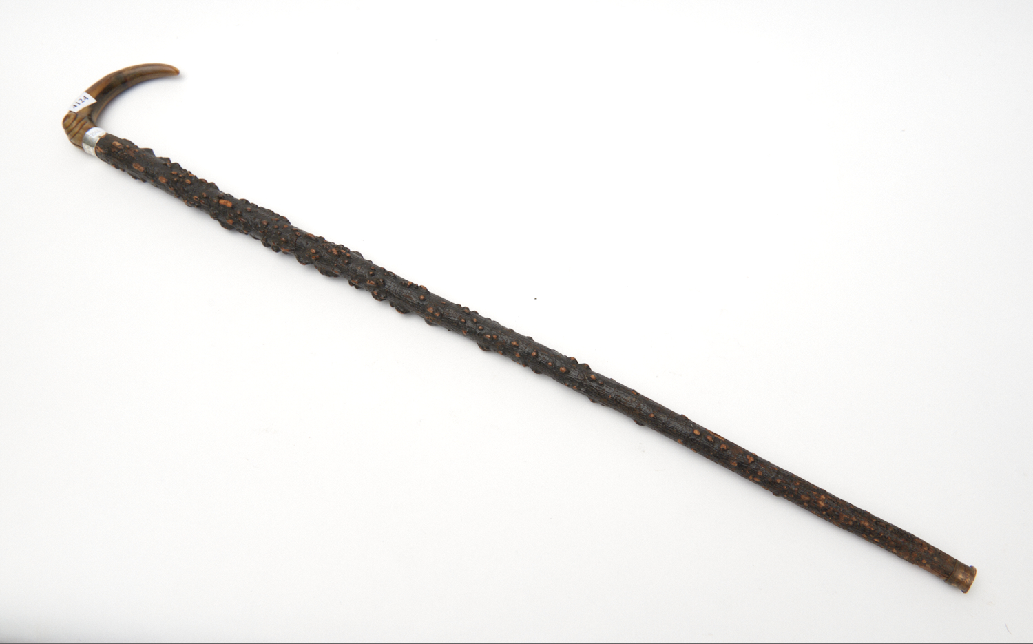 A 19TH CENTURY SCOTTISH WOODEN WALKING STICK WITH HORN HANDLE AND SILVER COLLAR