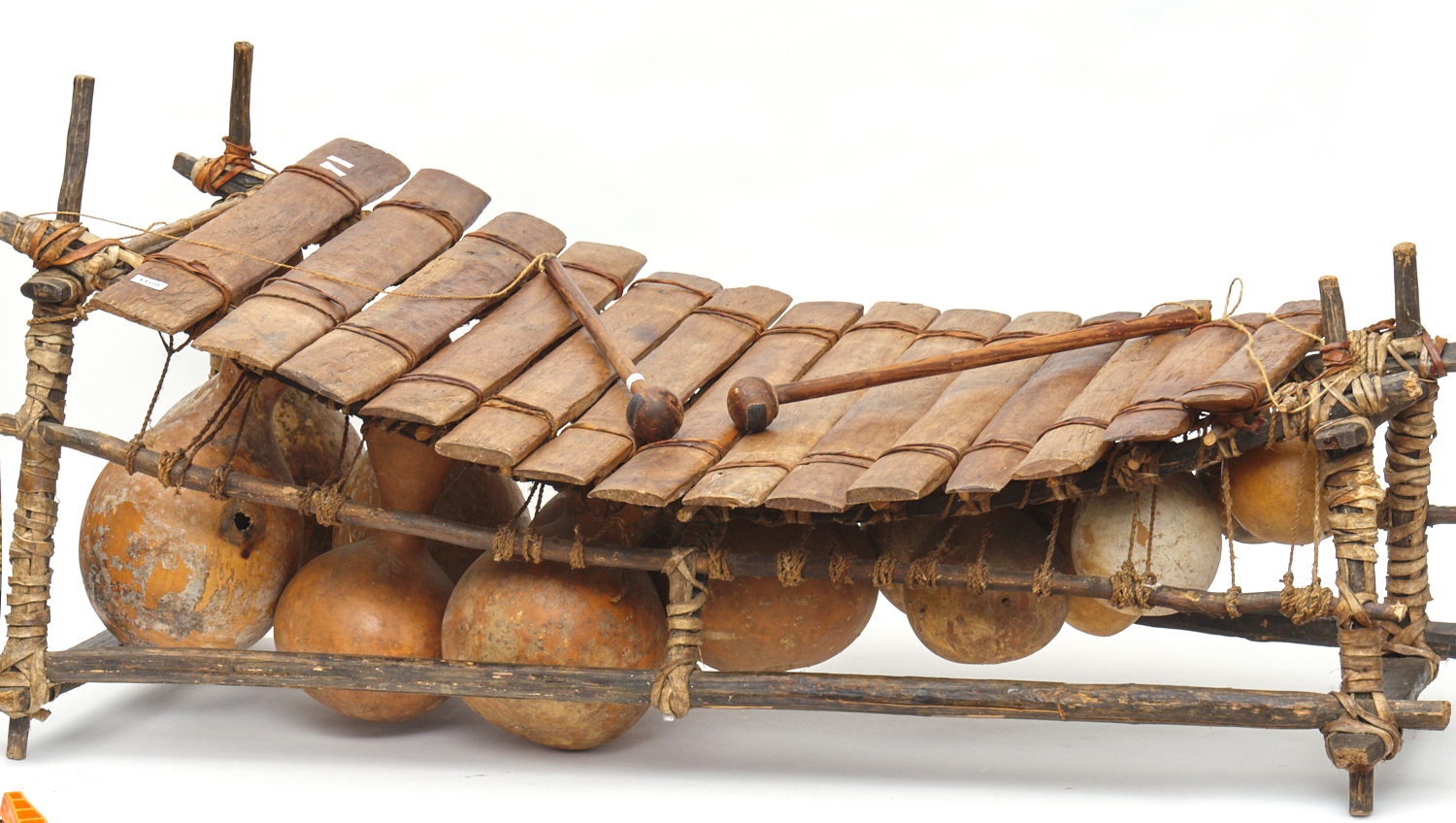 A 19TH CENTURY BELGIAN CONGO PRIMITIVE PERCUSSION INSTRUMENT WITH GOURDS