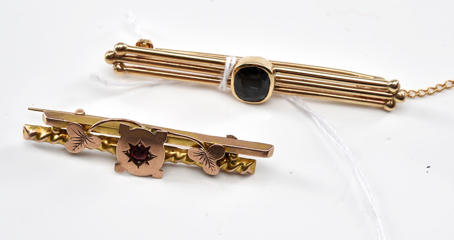 A SAPPHIRE BAR BROOCH IN GOLD, 5.5GMS (TOTAL LENGTH 50MM), TOGETHER WITH AN ANTIQUE AUSTRALIAN PASTE SET BAR BROOCH IN 9CT GOLD, 2.1GMS, HALLMARKED (TOTAL LENGTH 44MM)