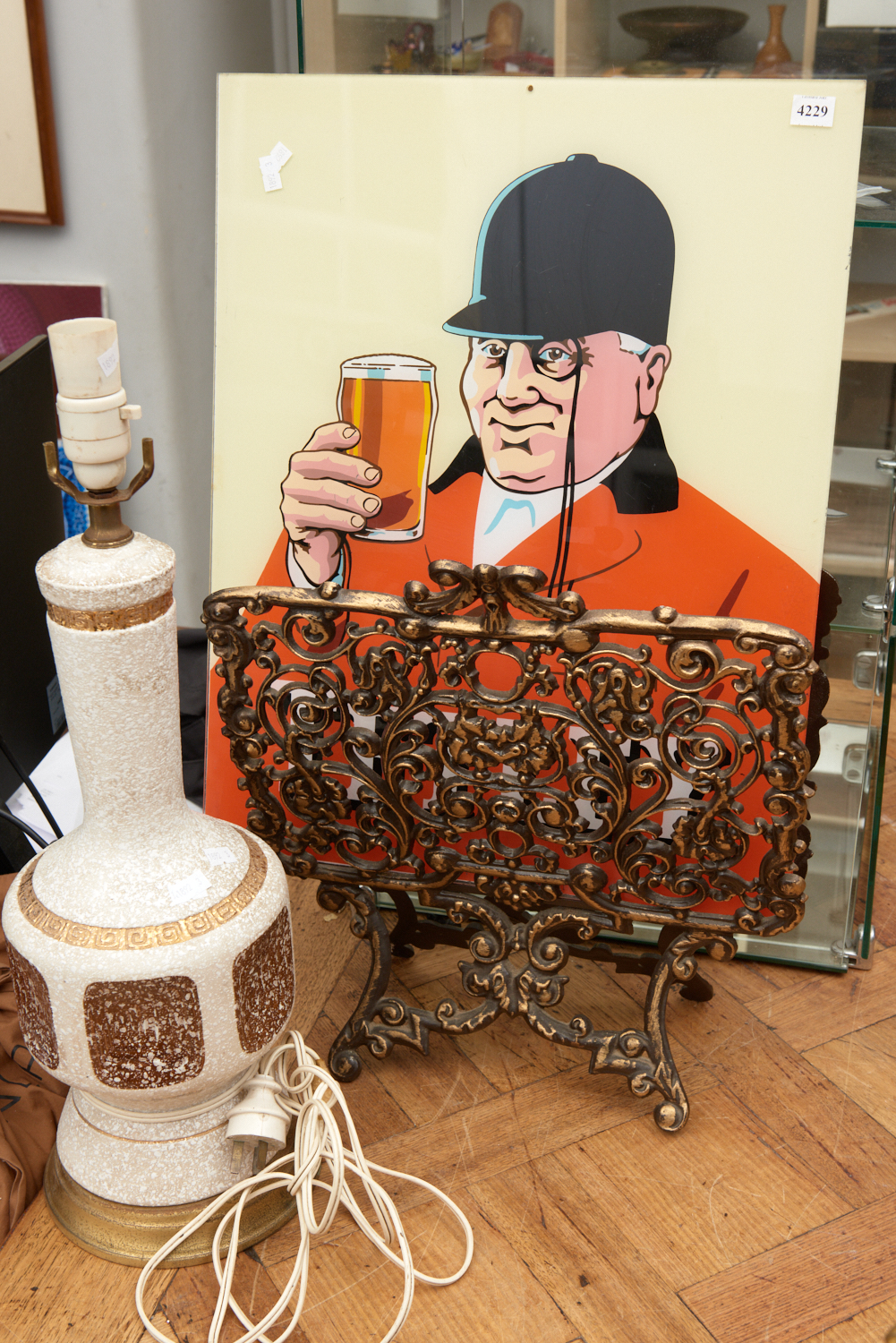 A VINTAGE CAST METAL MAGAZINE TIDY, A PERSPEX TETLEY SIGN, AND A RETRO CERAMIC MAP BASE