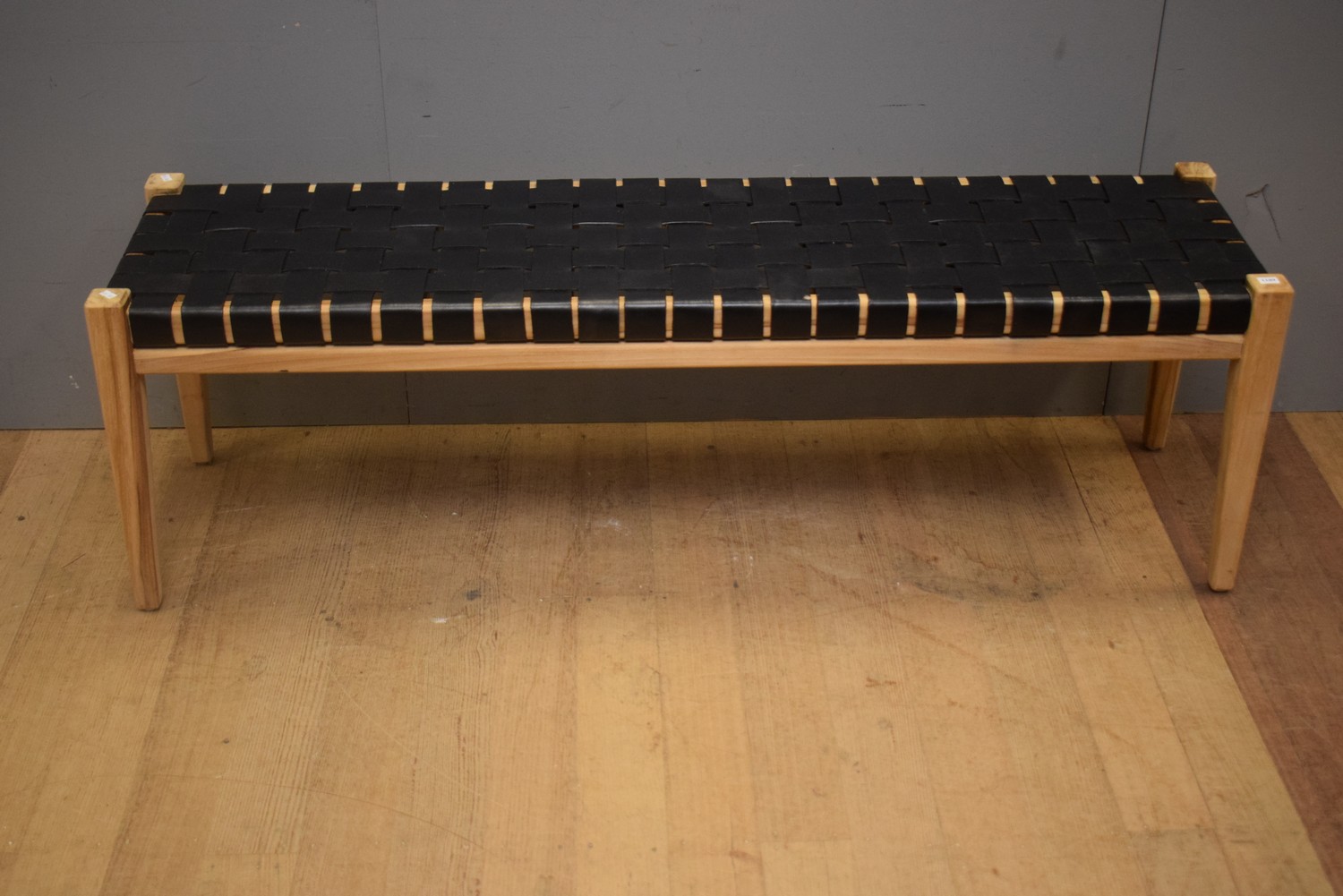 A TEAK AND LEATHER WEAVE BENCH (48H X 150W X 40D CM)
