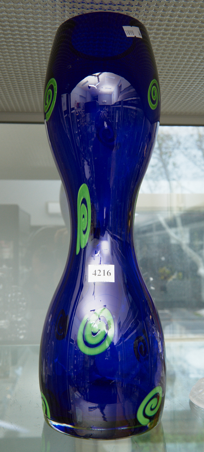 A BLUE ART GLASS HOURGLASS SHAPED VASE, SIGNED