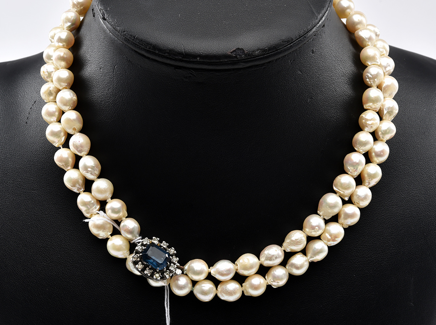 A STRAND OF BAROQUE CULTURED PEARLS TO A BLUE AND COLOURLESS PASTE CLUSTER CLASP IN SILVER, TOTAL LENGTH 875MM (MATINEE LENGTH)
