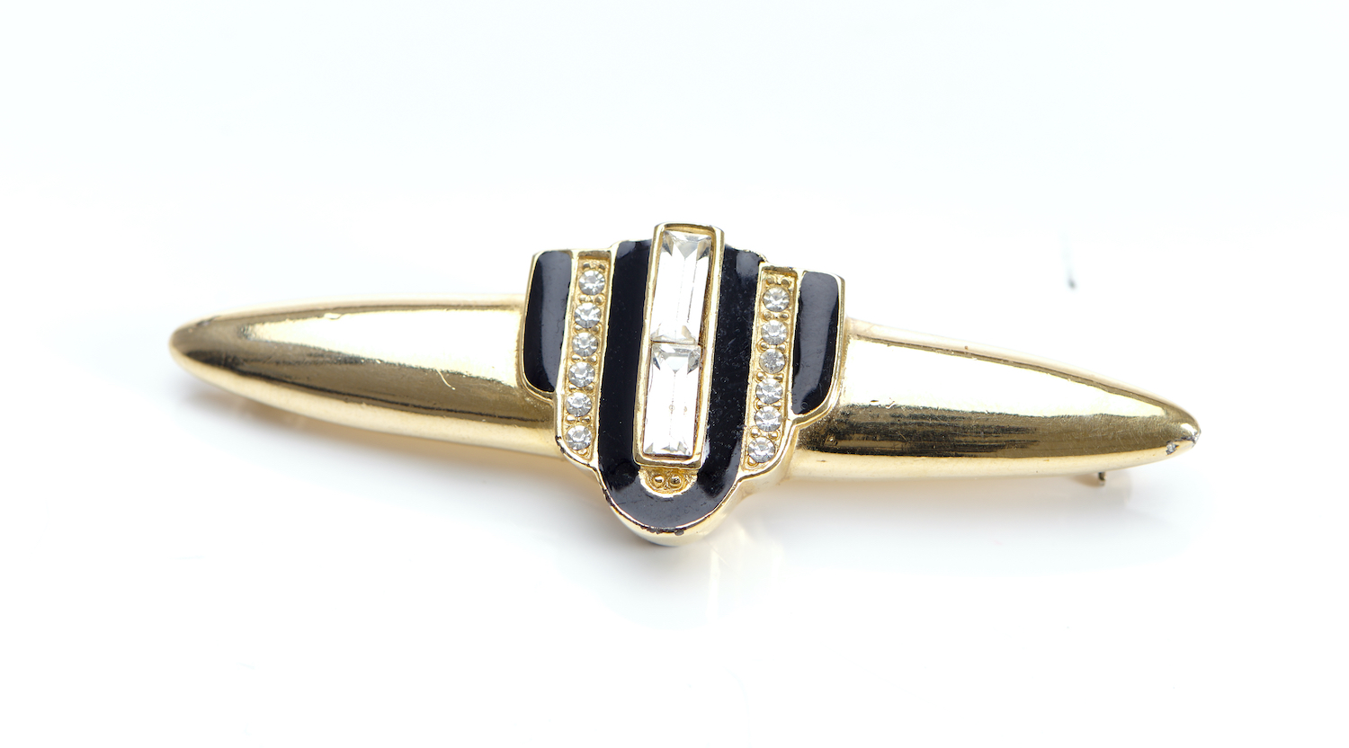 Art-Deco inspired, styled in gilt metal with paste and enamel detail, 7 x 2cm.