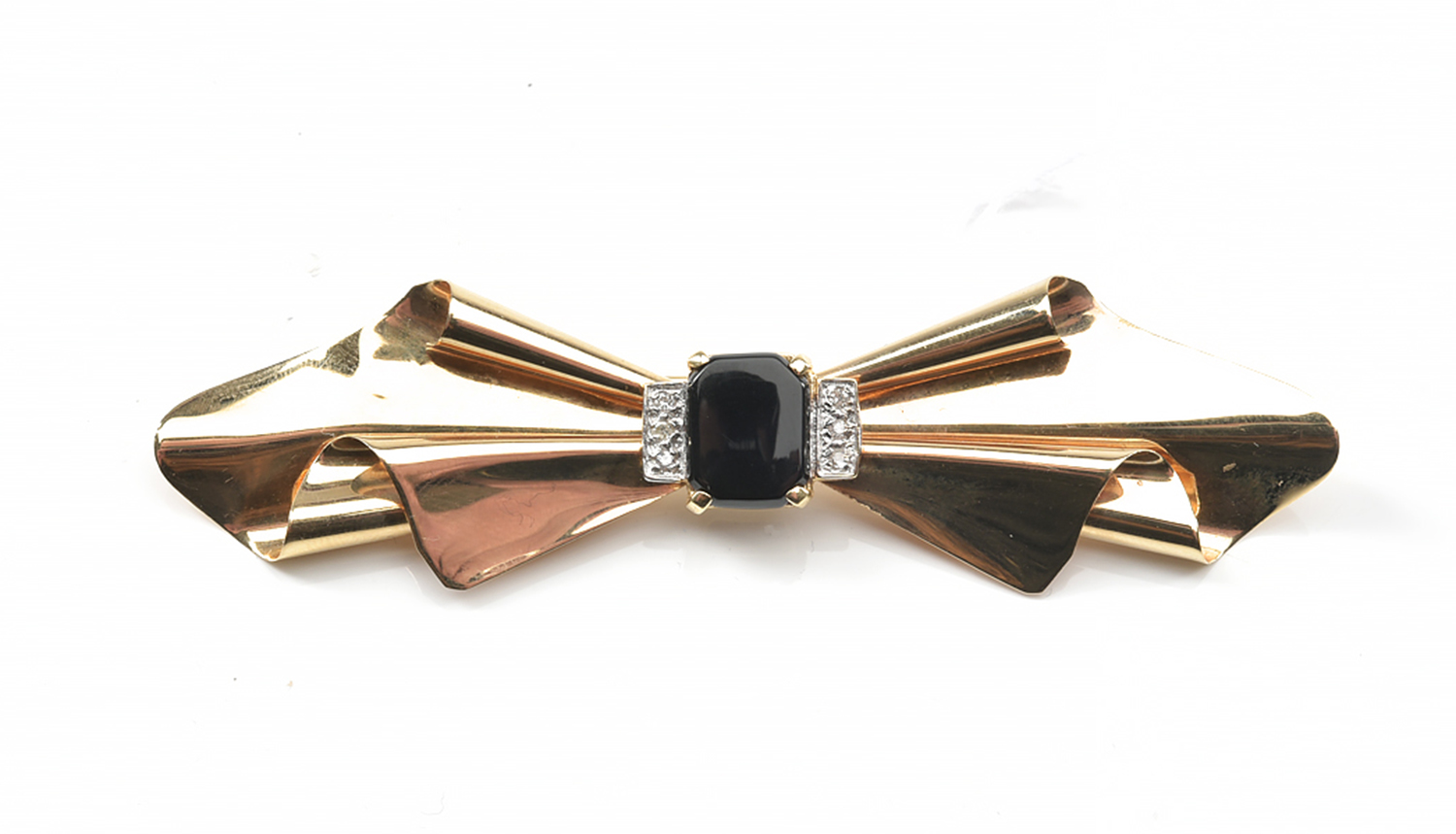 A RETRO ONYX AND DIAMOND BOW BROOCH, ACID TESTED IN 14CT GOLD, TOTAL LENGTH 80MM, 8.4GMS