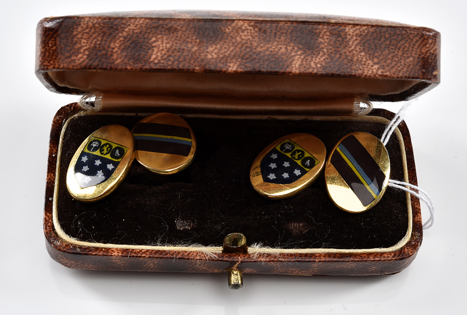 A PAIR OF HERALDIC CUFFLINKS IN SILVER GILT, IN A FITTED BOX