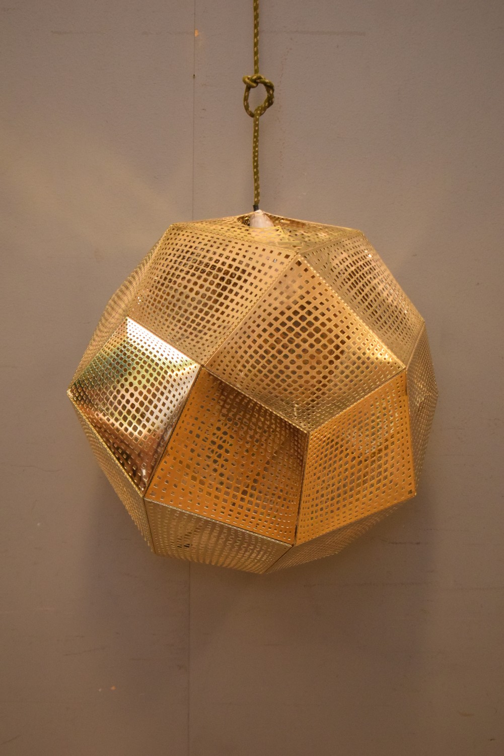 A PAIR OF TOM DIXON STYLE PERFORATED METAL PENDANT (A/F) (UNTESTED) (50H X 50D CM)