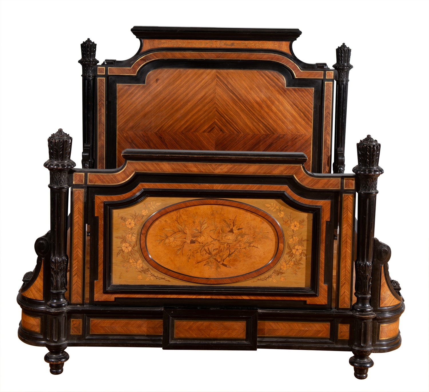 Noticeable fading to the bed head from sun exposure, losses and restorations to the veneer and ebonised carving, the overall having scratches, dents and stains all consistent with age, some lifting in places to the brass inlay, some impressions/marks to areas of the marquetry on head and foot, some later additions to the mattress frame supports and inner brackets.