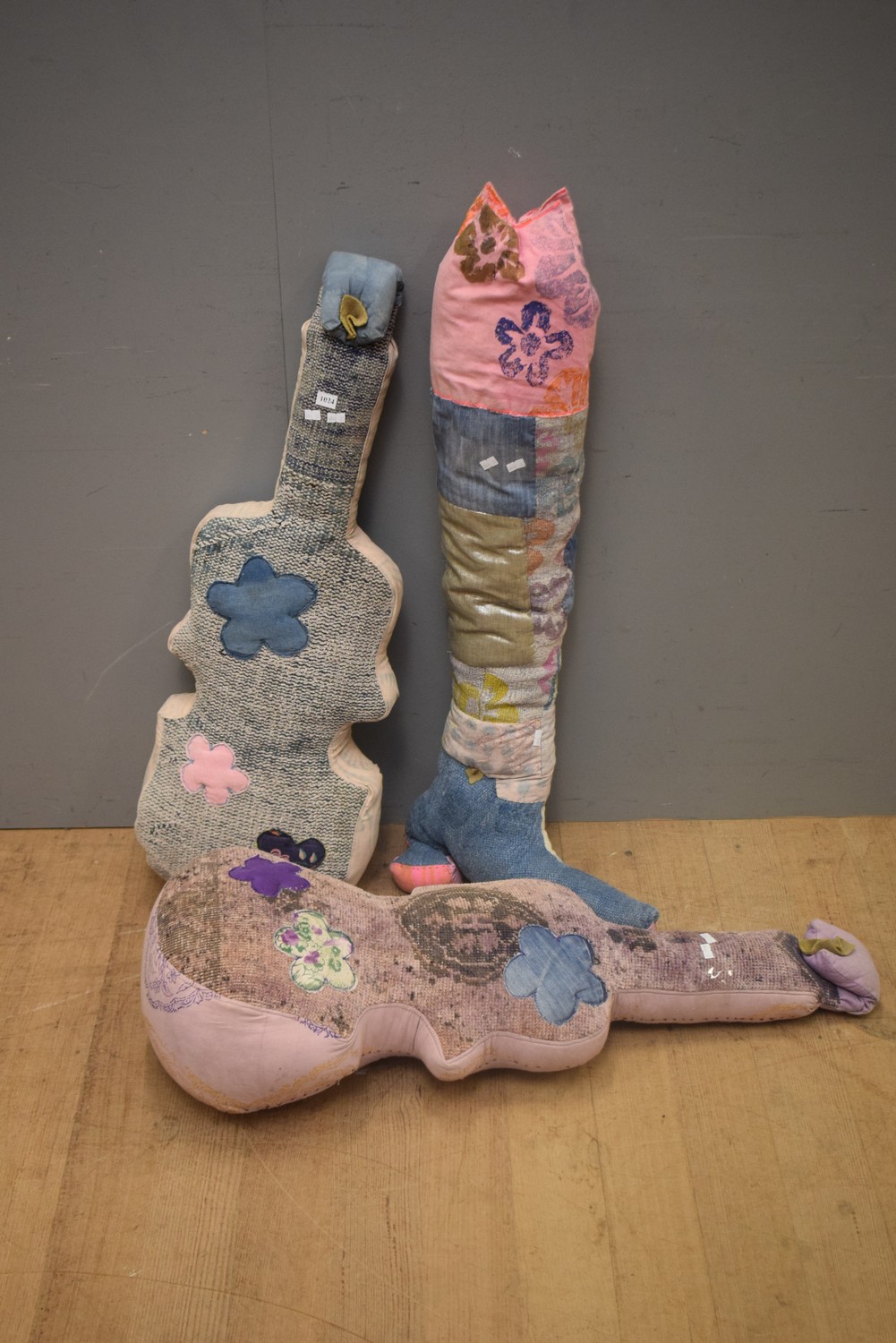 A COLLECTION OF THREE QUILTED PILLOWS, COMPRISING TWO CELLOS AND A BOOTED LEG (A/F) (LARGEST 107H CM)