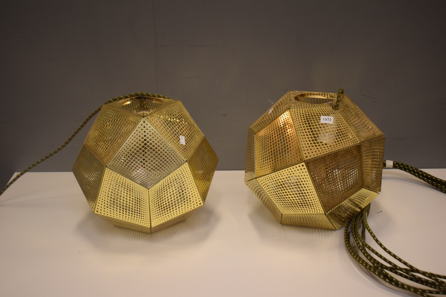 A PAIR OF TOM DIXON STYLE PERFORATED METAL PENDANTS (A/F) (30 CM H)