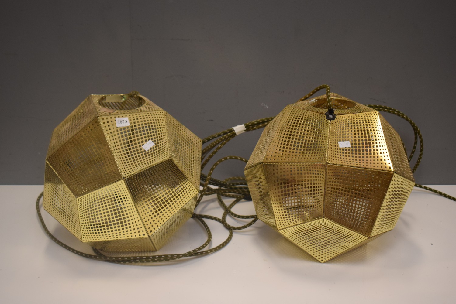 A PAIR OF TOM DIXON STYLE PERFORATED METAL PENDANTS (A/F) (30 CM H)