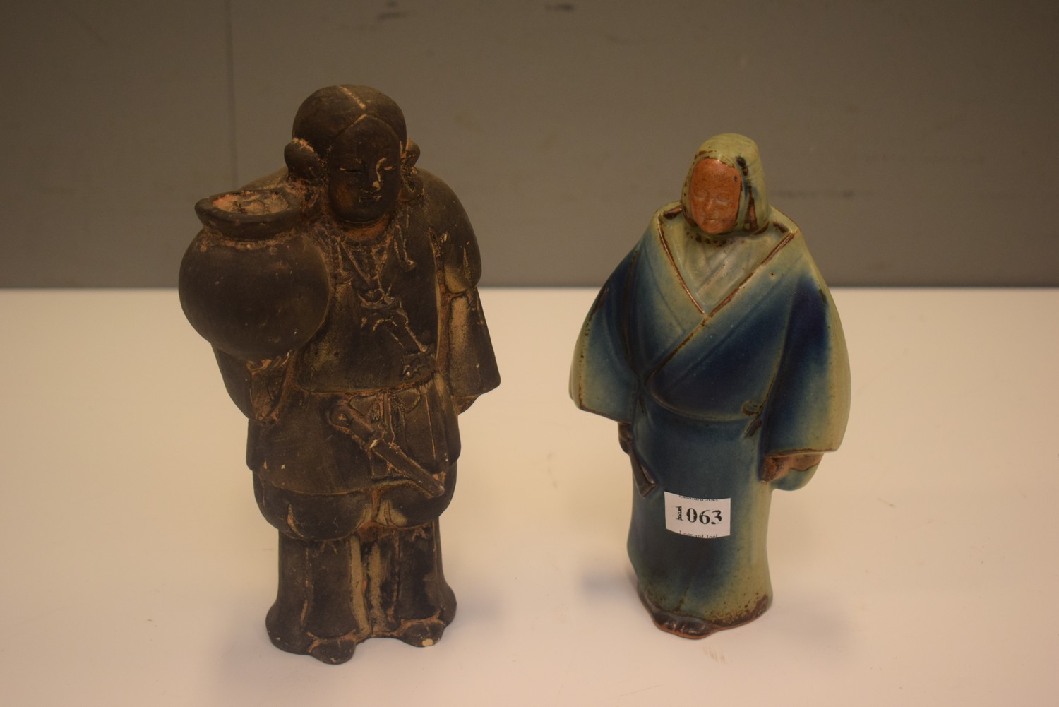 TWO JAPANESE FIGURES, ONE TERRACOTTA, ONE CERAMIC (LARGER 21 CM H)