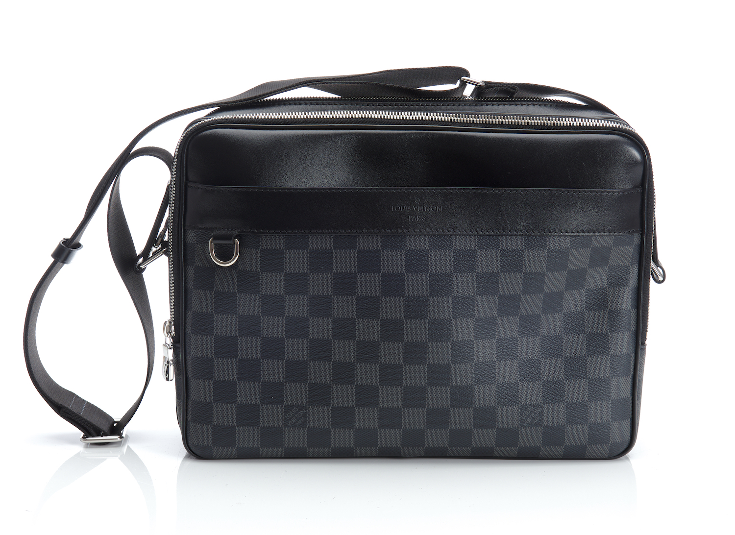 Styled in Damier Graphite with black leather trim, silver metal hardware and canvas shoulder strap, 24 x 32 x 9.5cm.