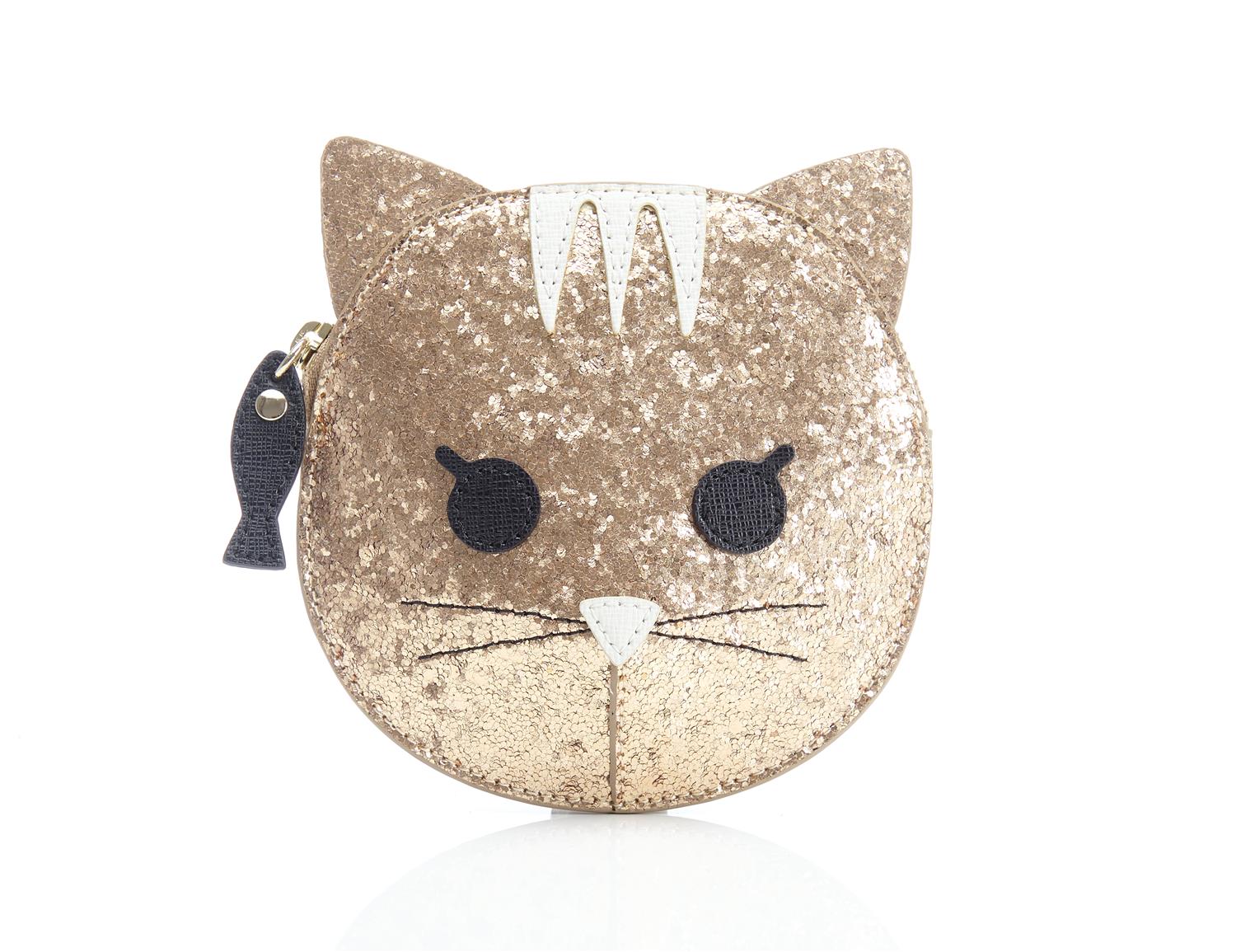 Styled as a cat in gold glittered leather, 12cm square, boxed.