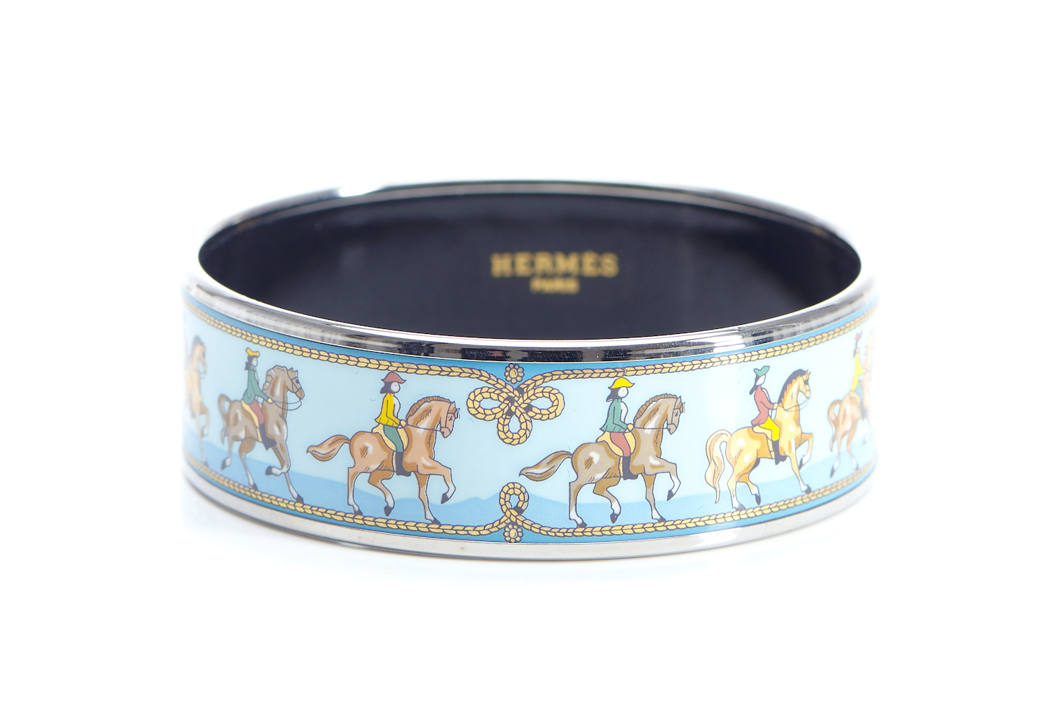 Styled with a horse and rider motif on a blue background, 6.5cm diameter.