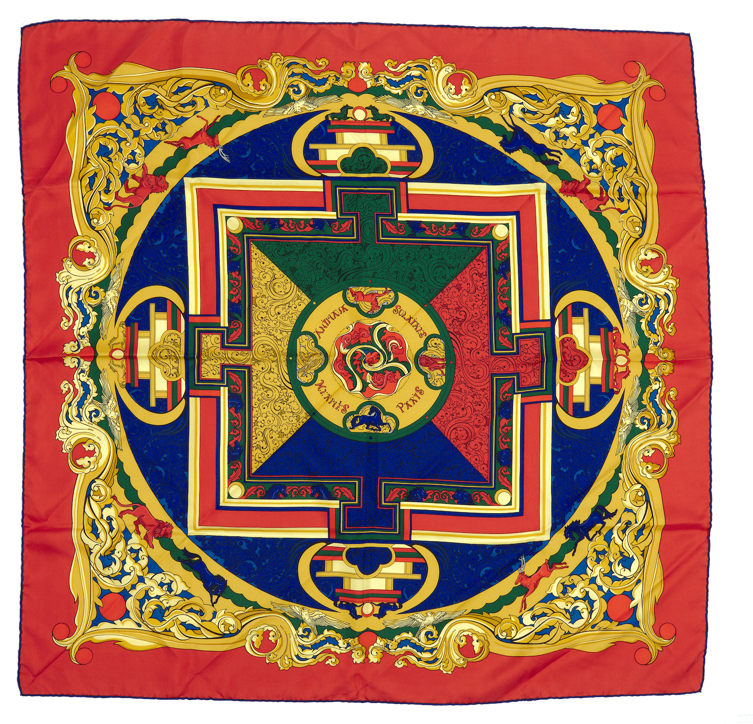 The 'Animaux Solaires' design by Zoe Pauwels, in blues and autumnal colours, 90cm square.