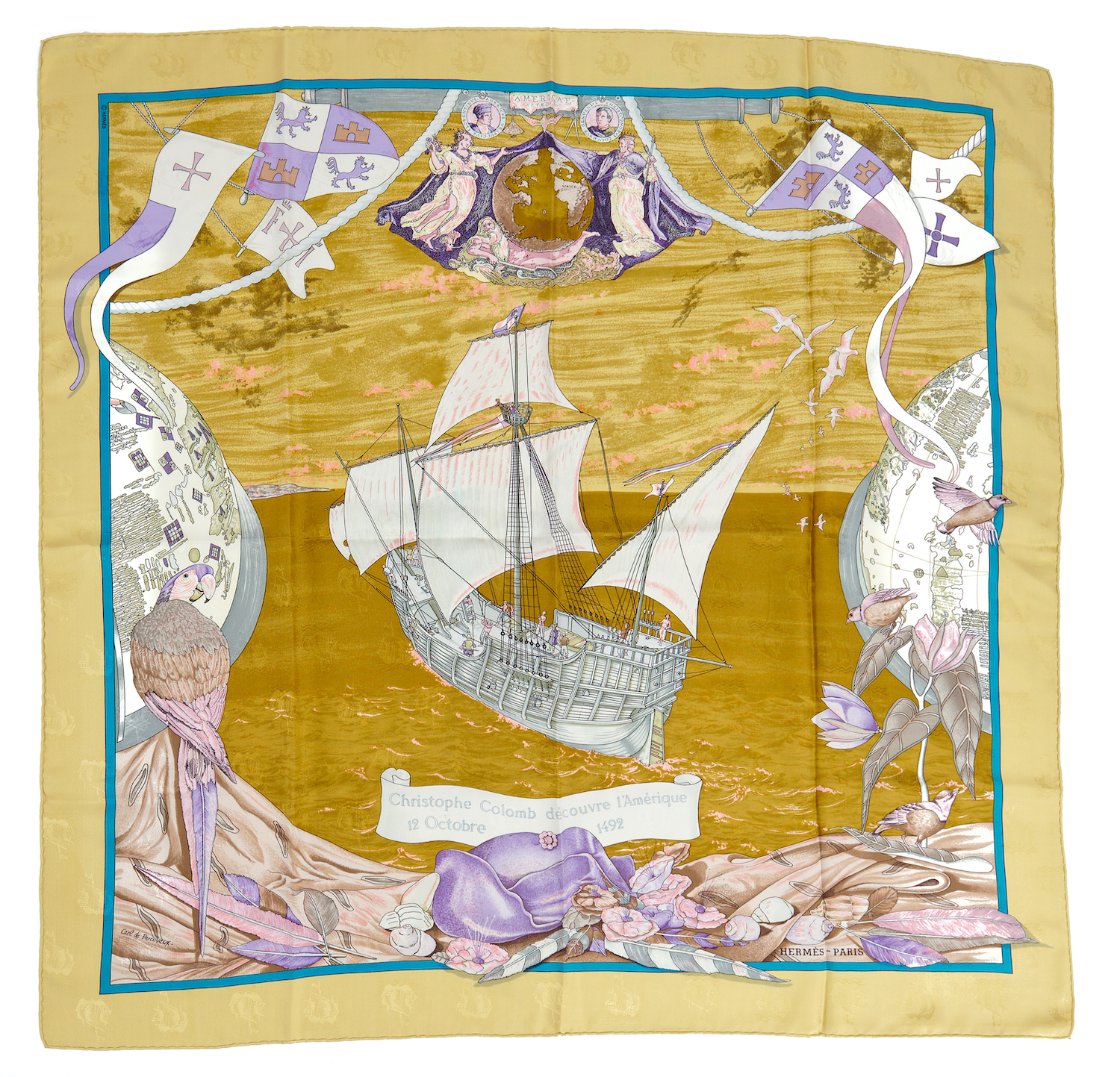 The 'Christophe Colomb Decouvre l'Amerique' design by Carl de Parcevaux, with ship motif on mustard background, 90cm square.