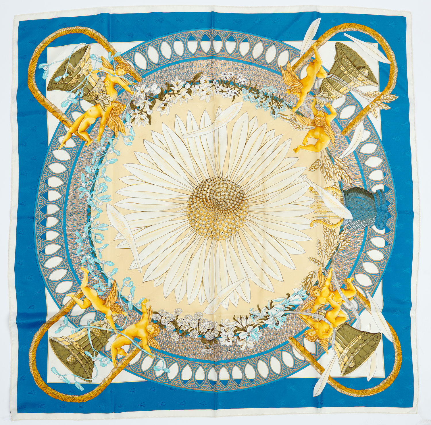 The 'Amours' design by Annie Faivre, with sunflower and cherub motif on blue background, 90cm square.