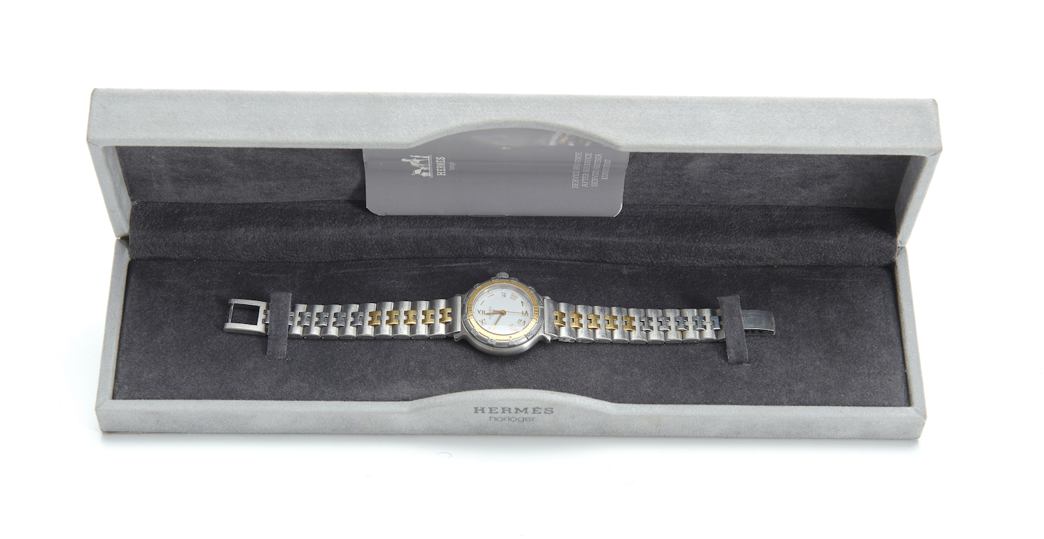 Quartz movement, circular white dial with Arabic numerals, stainless steel and gold plated bands, total length 160mm, case diameter 25mm, boxed.