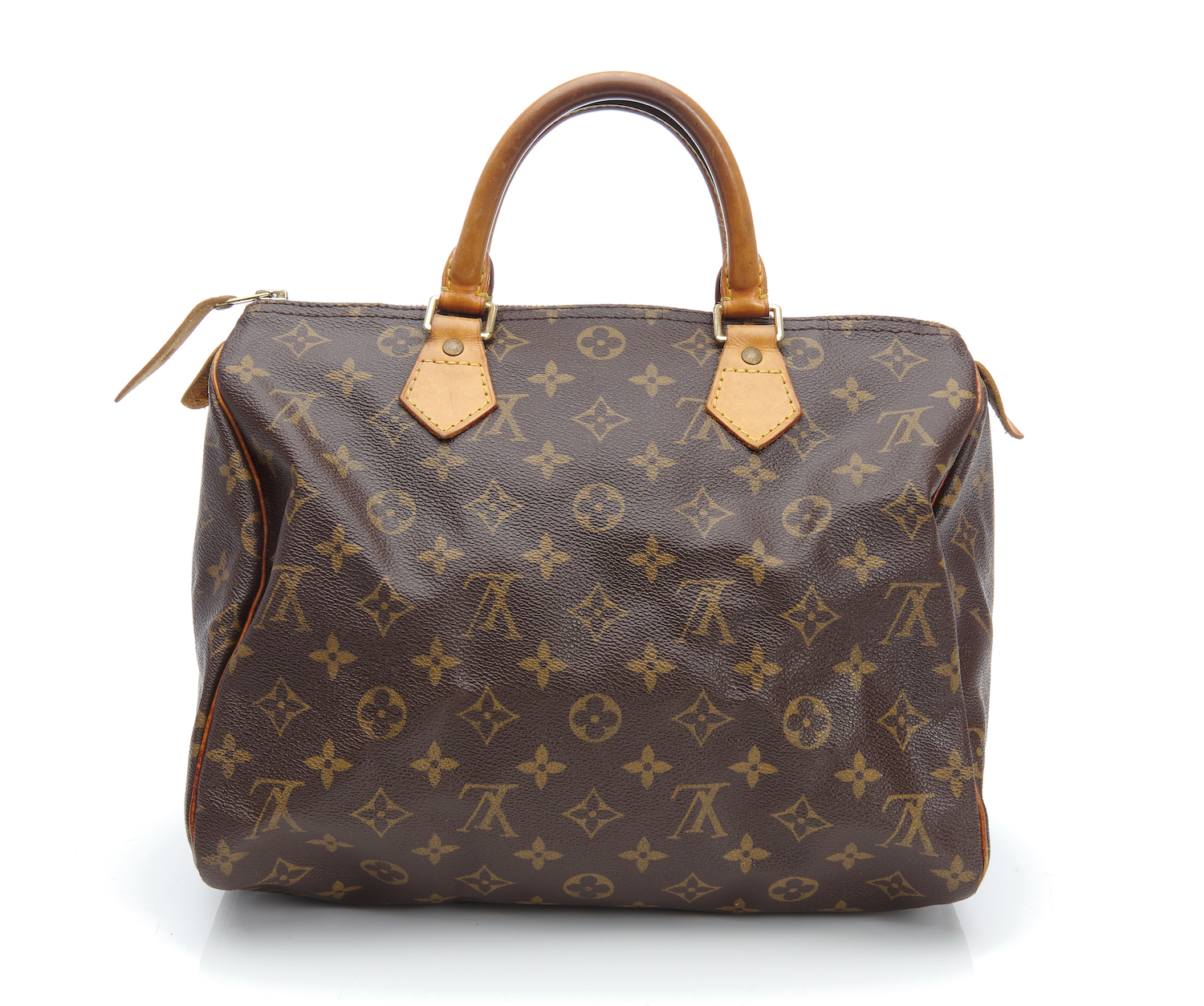 Styled in monogram coated canvas with tan leather trim and gold metal hardware, 30 x 20 x 17cm.