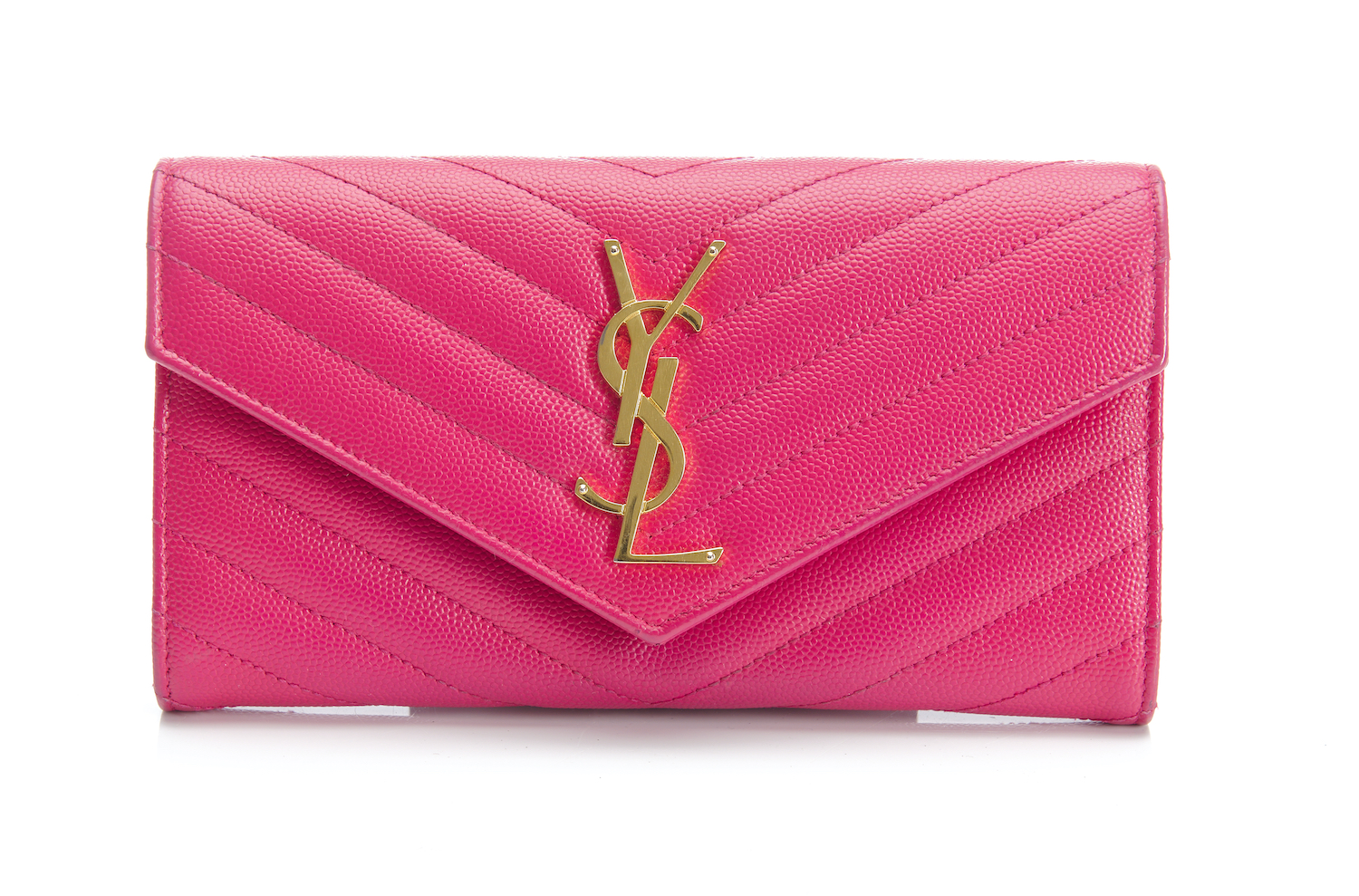 Styled in pink grained chevron leather with gold metal hardware, 19 x 10.5 x 2cm.