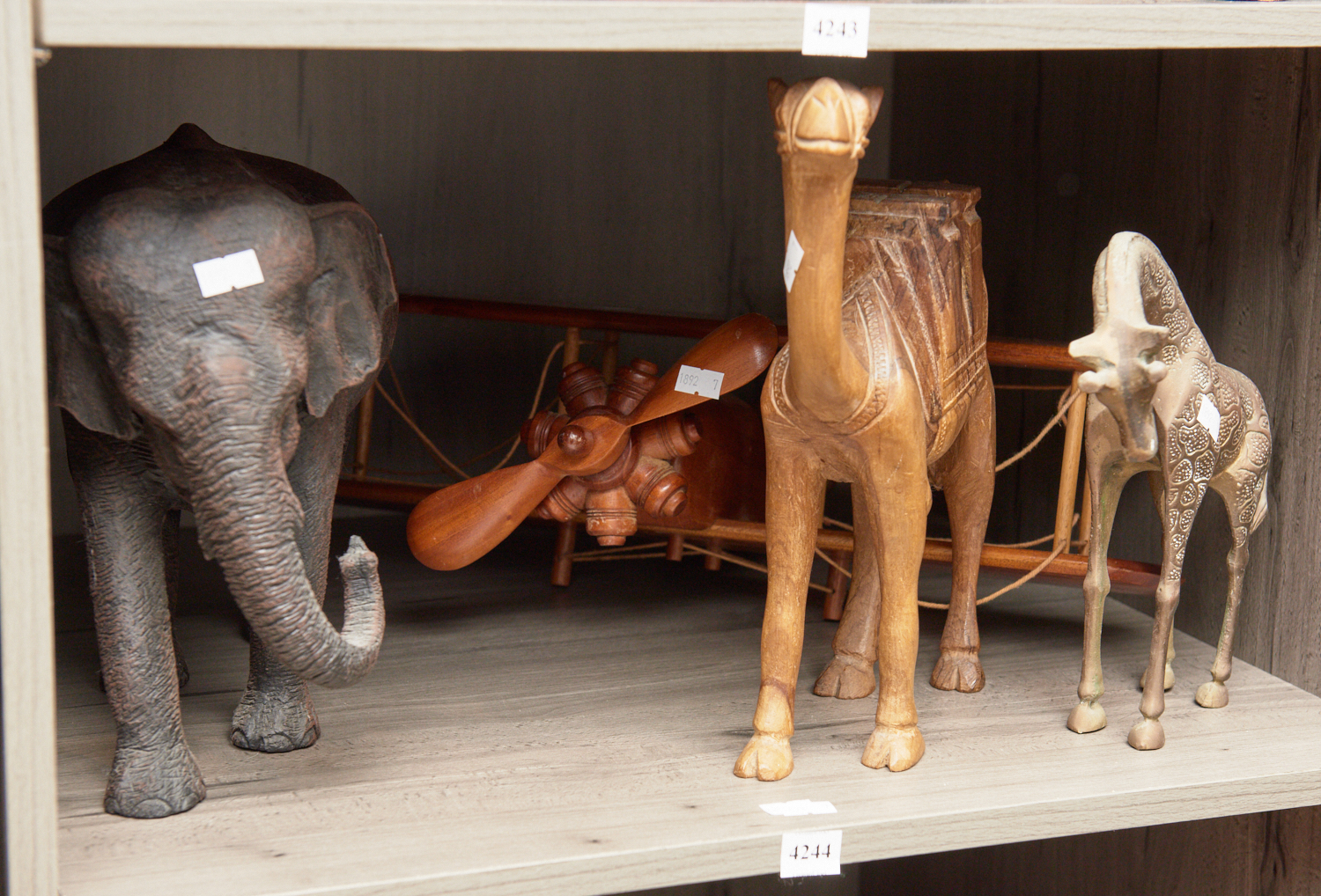 A BRONZE GIRAFFE, AN ELEPHANT AND CAMEL FIGURINES, TOGETHER WITH A MODEL/TOY PLANE