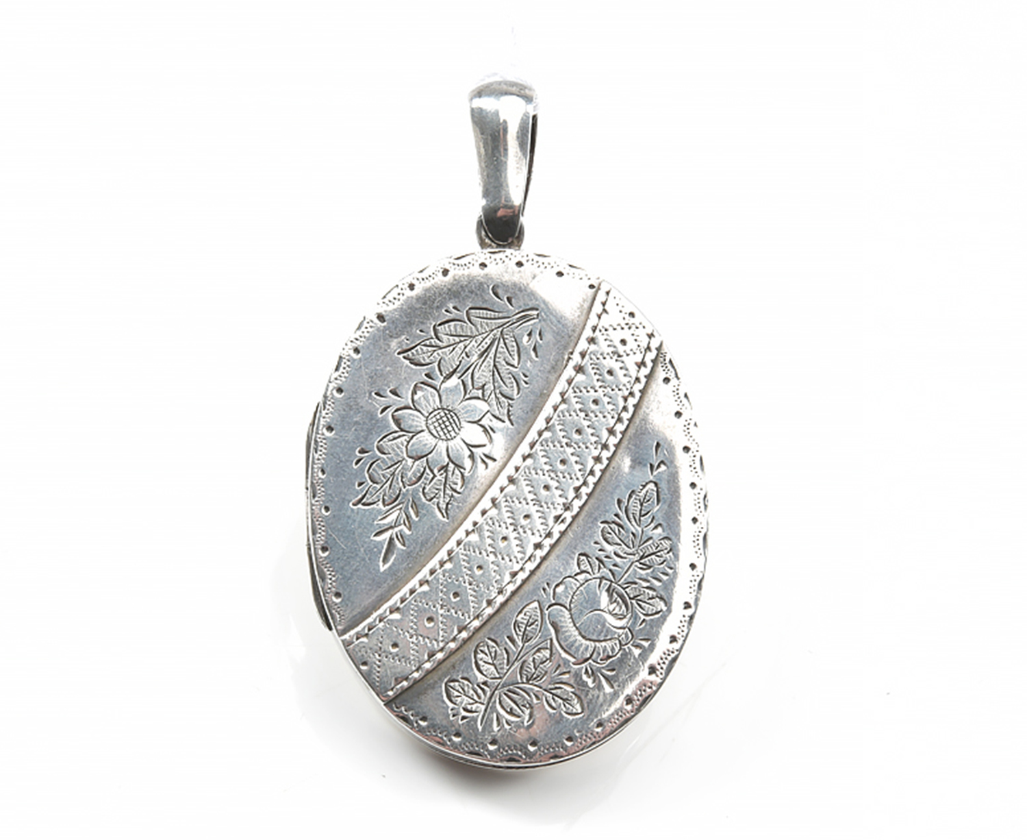 A VICTORIAN OVAL LOCKET, ENGRAVED WITH FLORAL DECORATION, IN STERLING SILVER, HALLMARKED BIRMINGHAM, 1887, 40X30MM