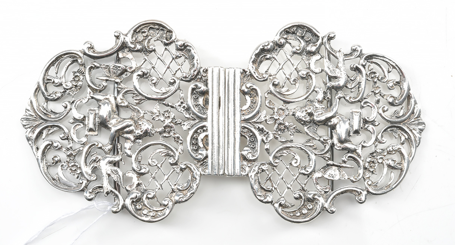 A VICTORIAN BELT BUCKLE WITH CHERUB AND SCROLL DECORATION, IN STERLING SILVER, LONDON, 1894, TOTAL LENGTH 135MM (WHEN BOTH ATTACHED)