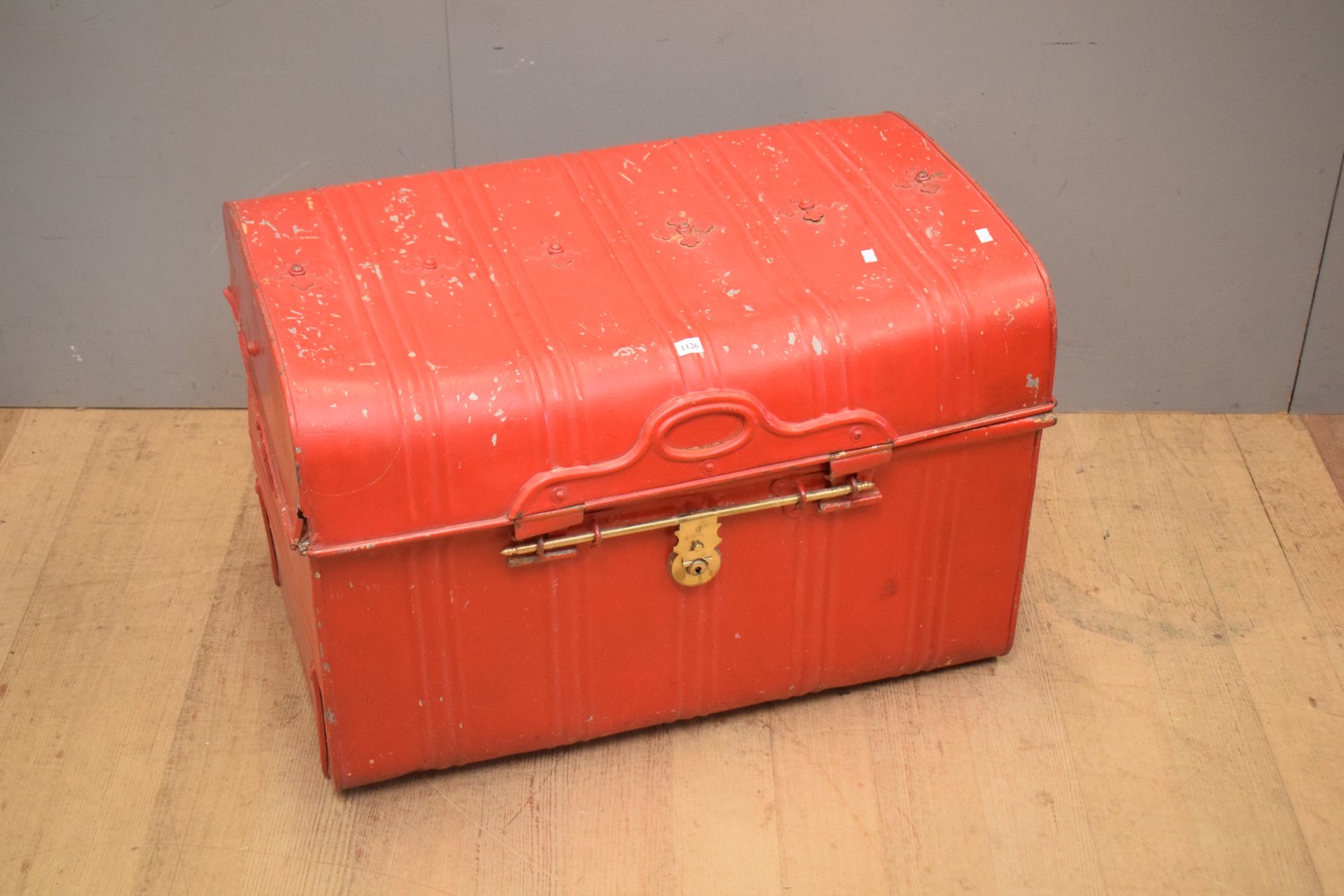 A RED PAINTED METAL TRUNK (51H X 71W X 50D CM)
