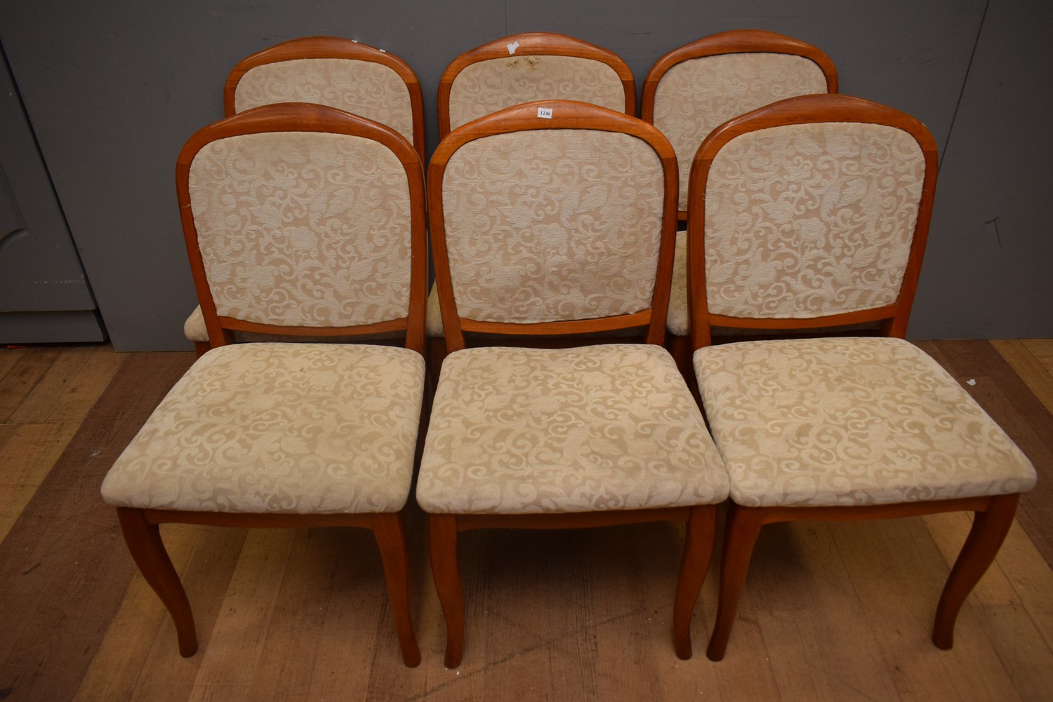 A SET OF SIX TEAK MID-CENTURY DINING CHAIRS (A/F TO UPHOLSTERY) (90H X 50 X 56 CM)