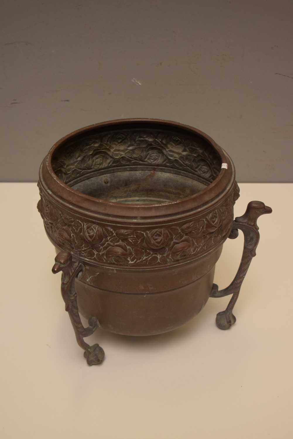 A DECORATIVE SOLID BRASS POT WITH CLAW AND BALL FEET (26H X 32W CM)
