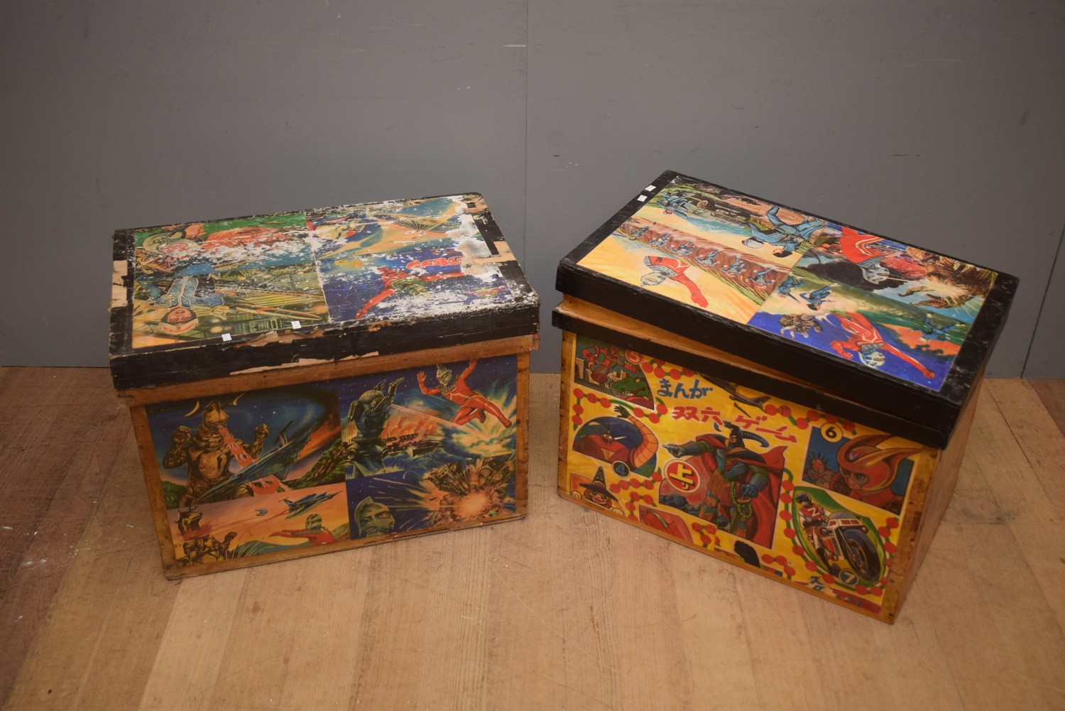 TWO TIMBER TEA CHESTS WITH COMIC DECOUPAGE (LARGER 47H X 67W X 44D CM) (A/F)