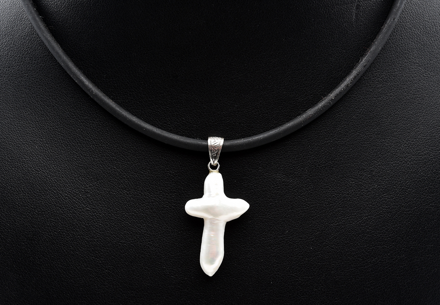 A FRESHWATER PEARL CROSS PENDANT TO A NEOPRENE COLLAR